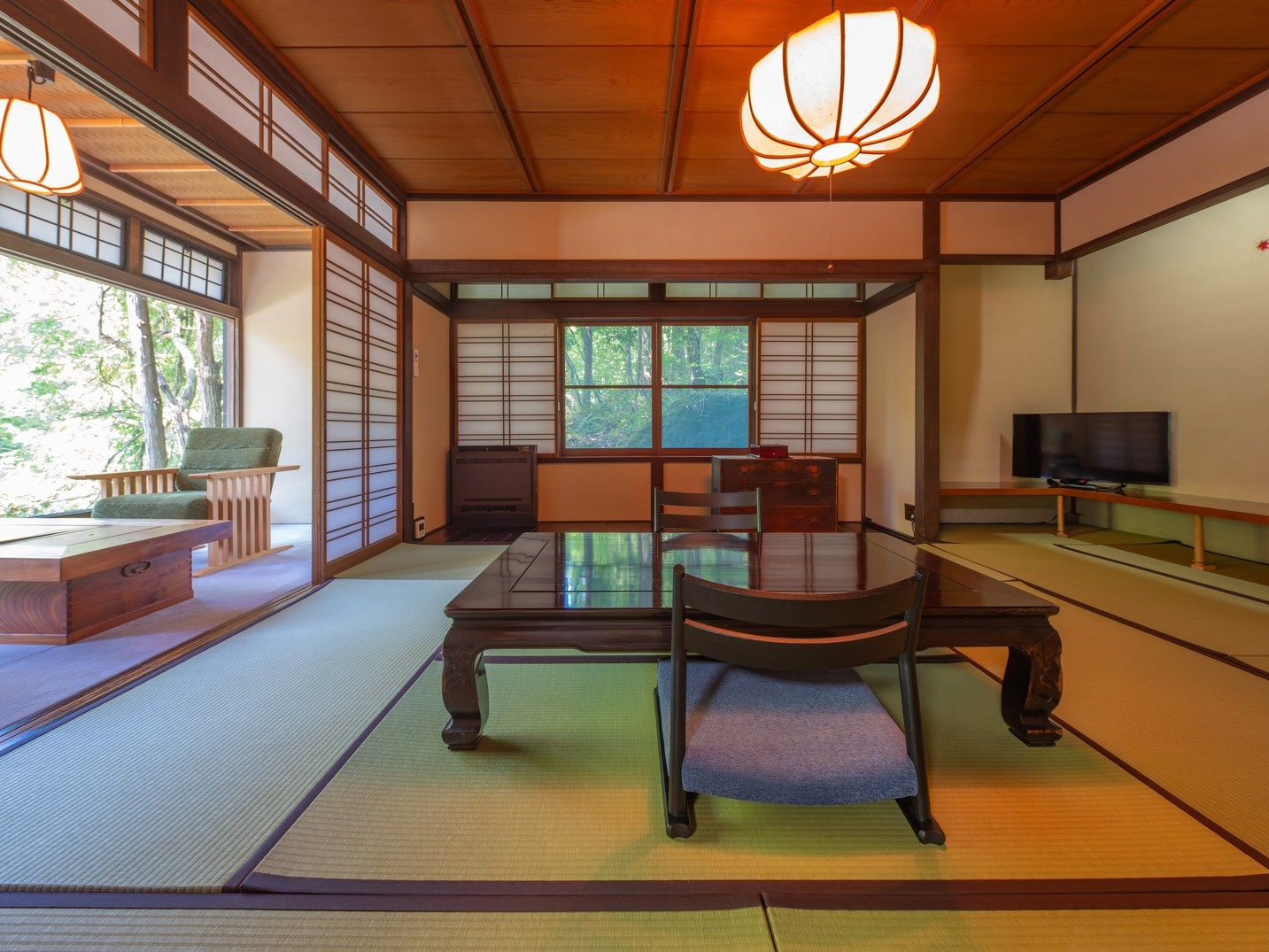 <客室10帖+次の間7帖+談話室+檜風呂>本館1階にあり、眼前に流れる宮川のせせらぎが心地よく、飛騨の自然を全身で感じていただくことができます。