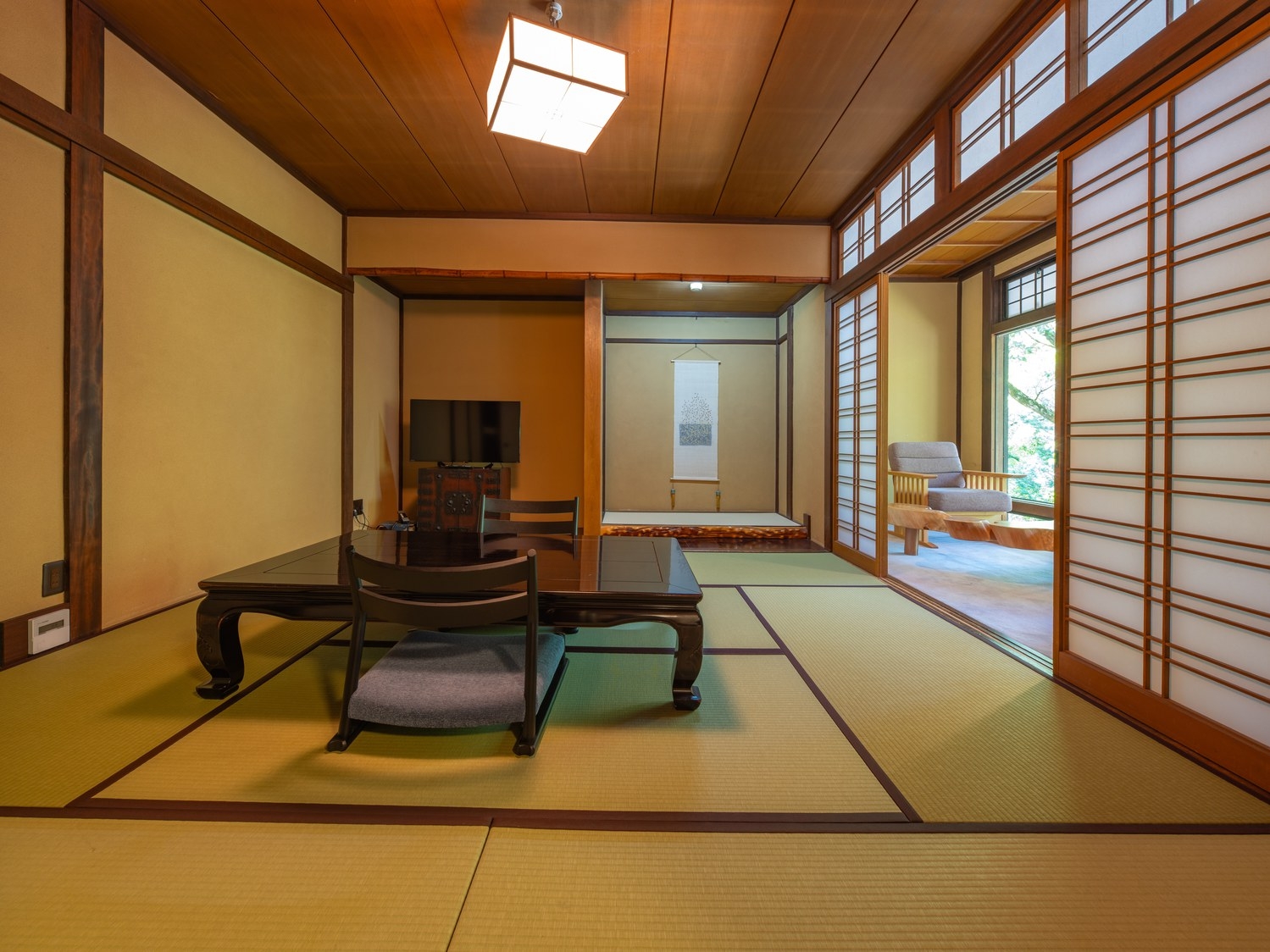 <客室8帖+次の間6帖+縁+檜風呂>清流宮川を見下ろす本館2階客室。二間続きの客室からは大自然のダイナミックなパノラマが広がります。