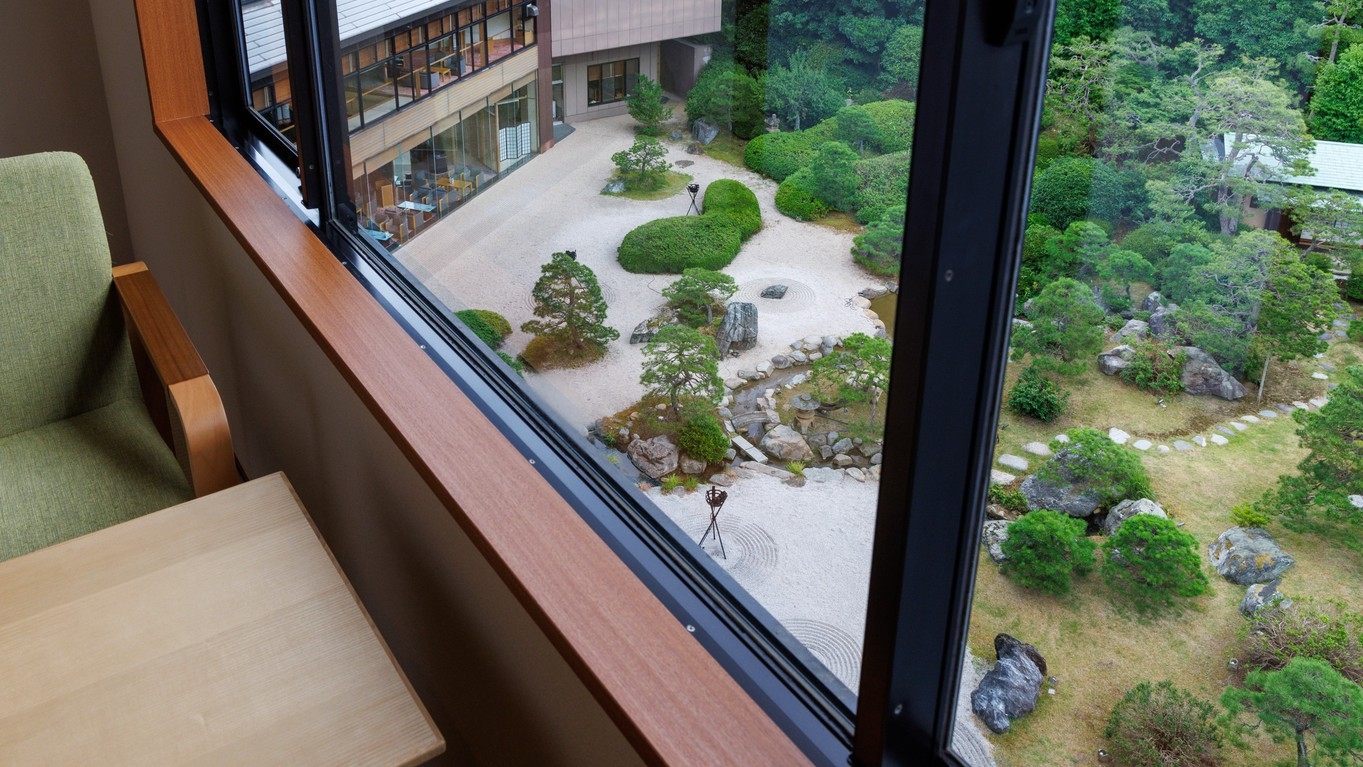 ・日本庭園が見えるラウンジで、18時までは生ビールや島根の日替わり地酒が無料で飲み放題