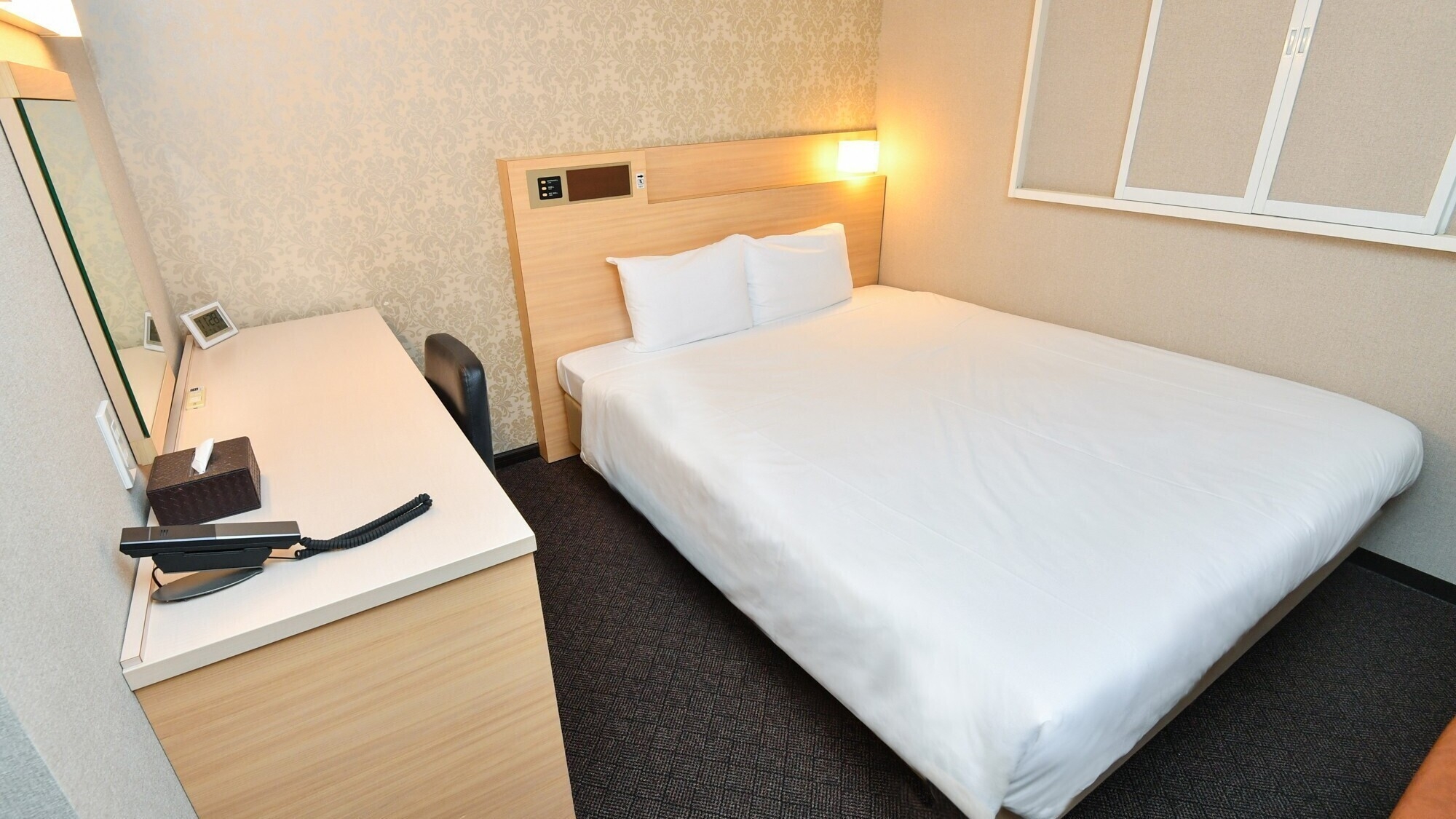 ベッド幅160センチのダブルベッド。全室シャワートイレ・加湿機能付空気清浄機完備。インターネット接続無料。添い寝の幼児は1名様までとさせていただきます。
