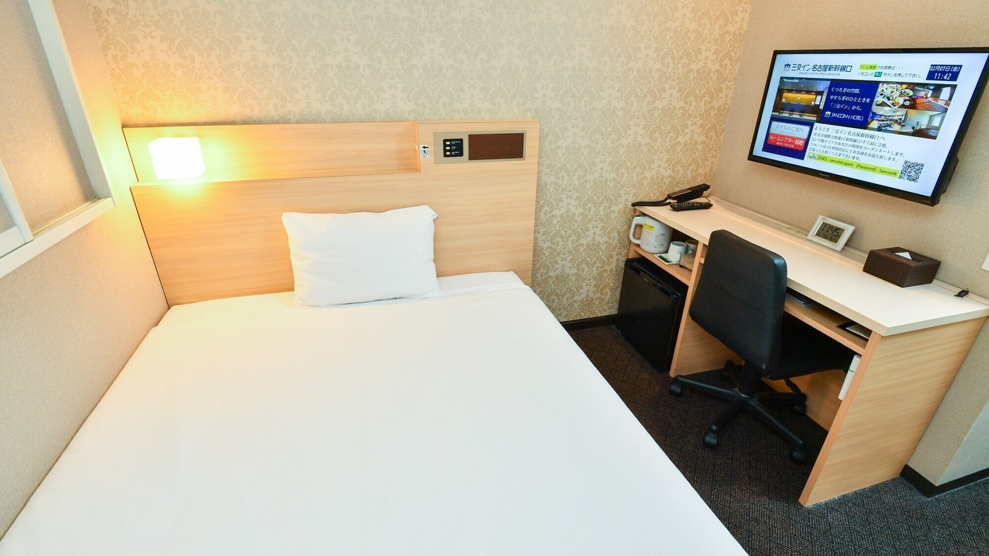 ベッド幅140センチのダブルベッド。全室シャワートイレ・加湿機能付空気清浄機完備。インターネット接続無料。添い寝の幼児は1名様までとさせていただきます。