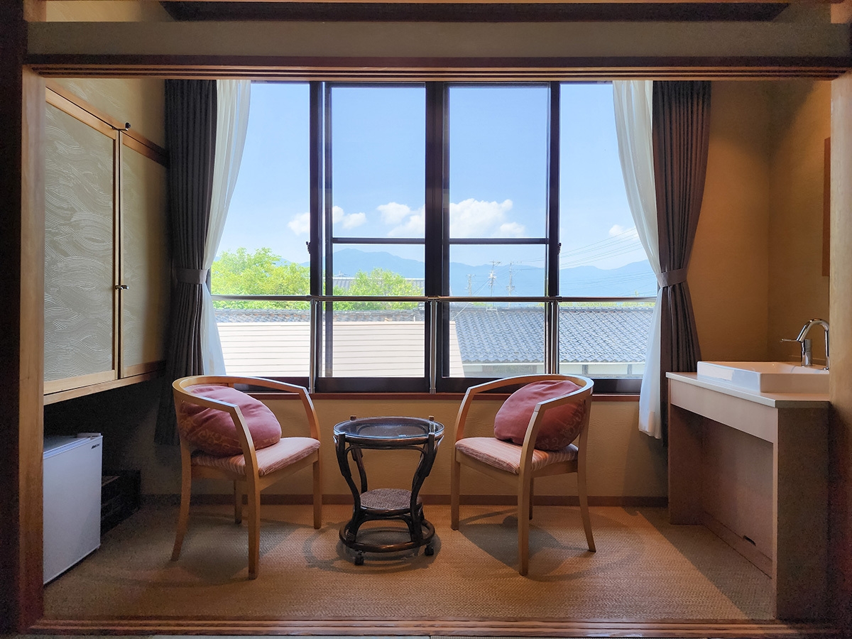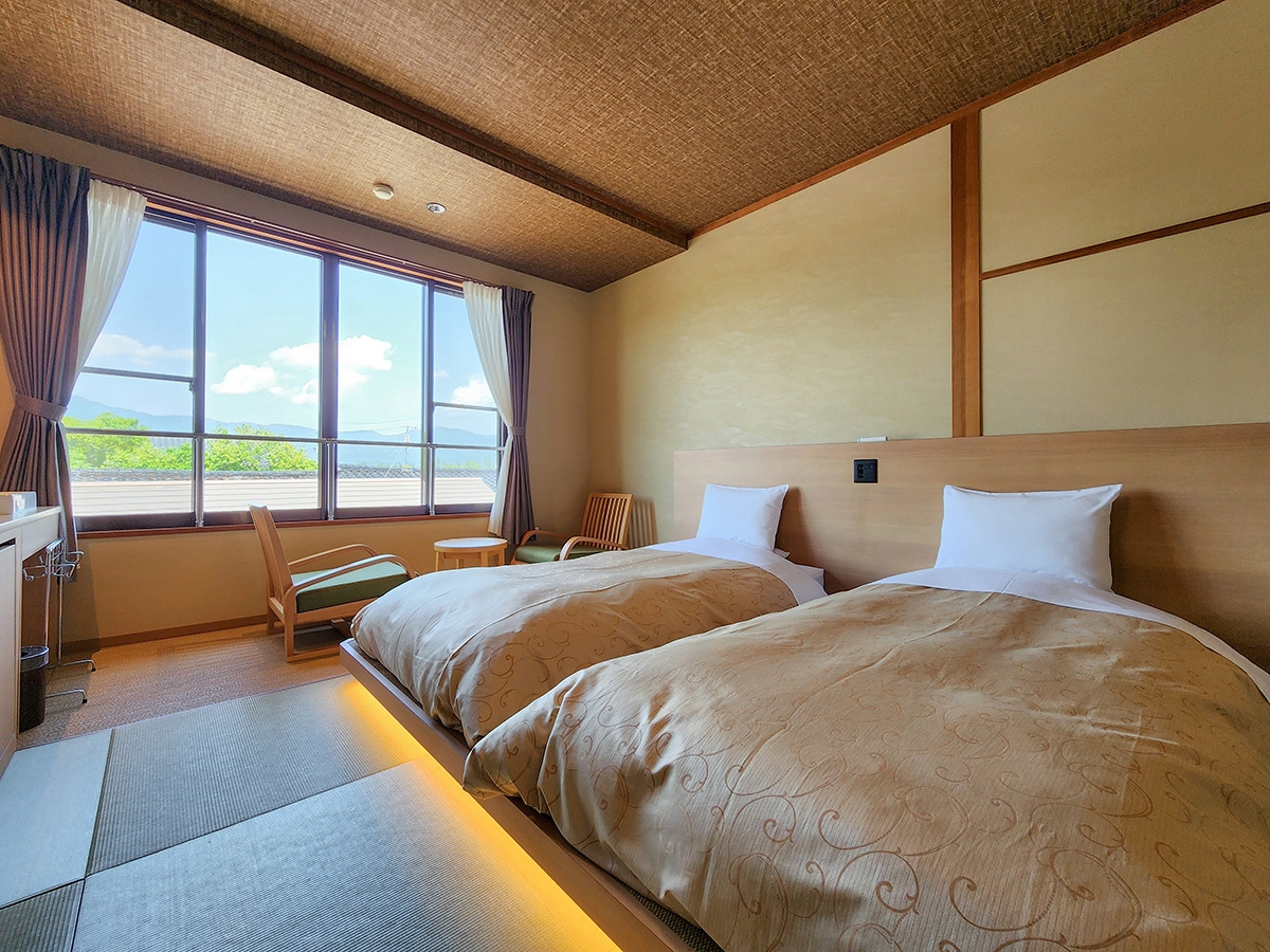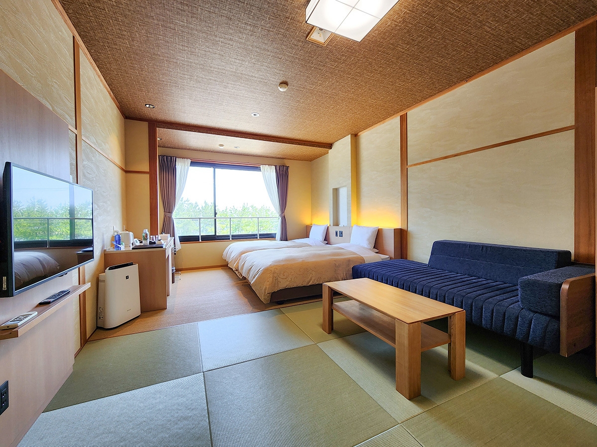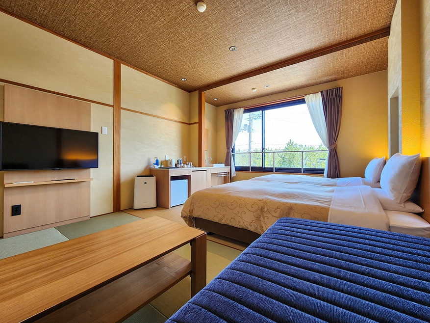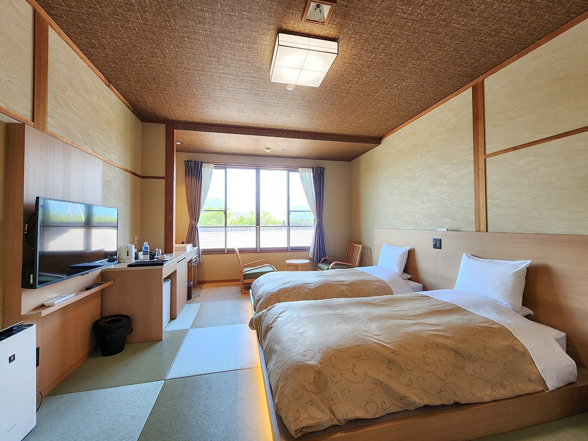 海が見える畳敷き×ベッドの和洋室です。加湿機能付き空気清浄機完備。ベッドは抗菌・抗ウイルスに優れたフランスベッド。※3名以上はソファーベッド・お布団になります。