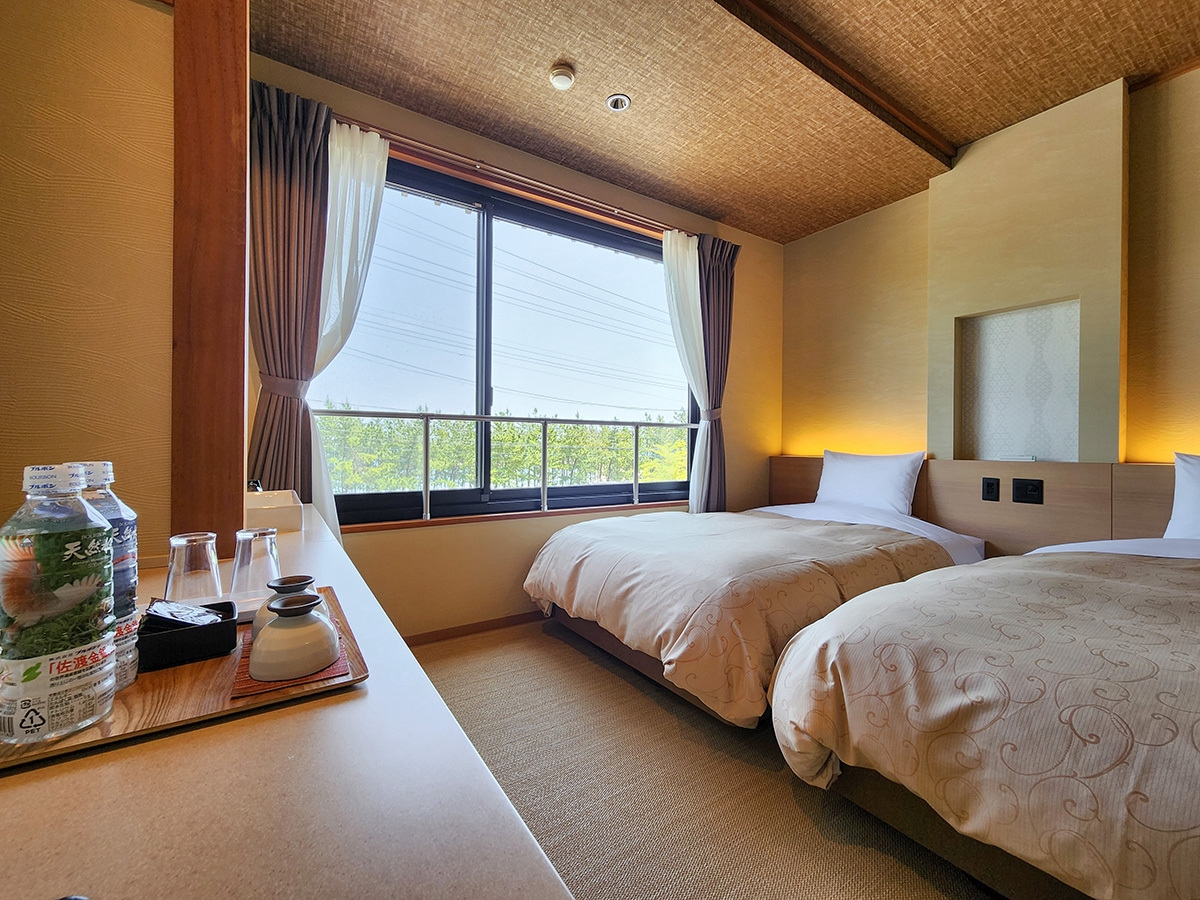 和室×2名様用の小上がりツインベッド。加湿機能付き空気清浄機完備。ベッドは抗菌・抗ウイルスに優れたフランスベッド※3名様の場合は1名様はお布団になります。