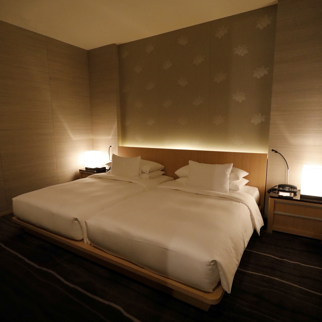 ゆとりのある44.8平米の広さに100cm幅のベッドが2台、全室18階以上の高層階、全室LAN回線完備