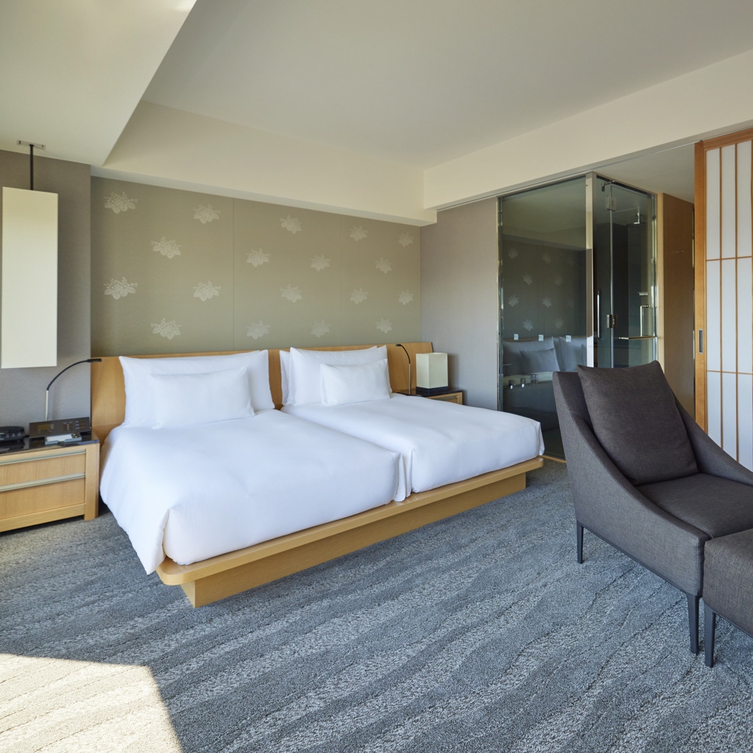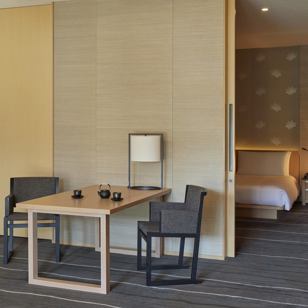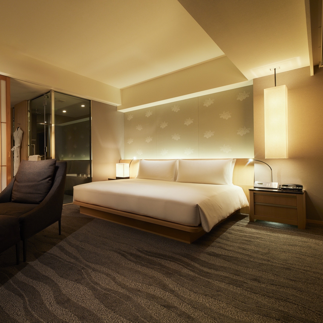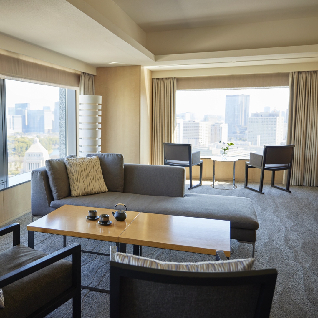 目の前に庭園と日枝の杜が広がる5階の特別スイート。窓を開ければ都心にいながら自然の風を感じていただけます。洗練された和モダンな空間は和らぎの時間をお約束します。