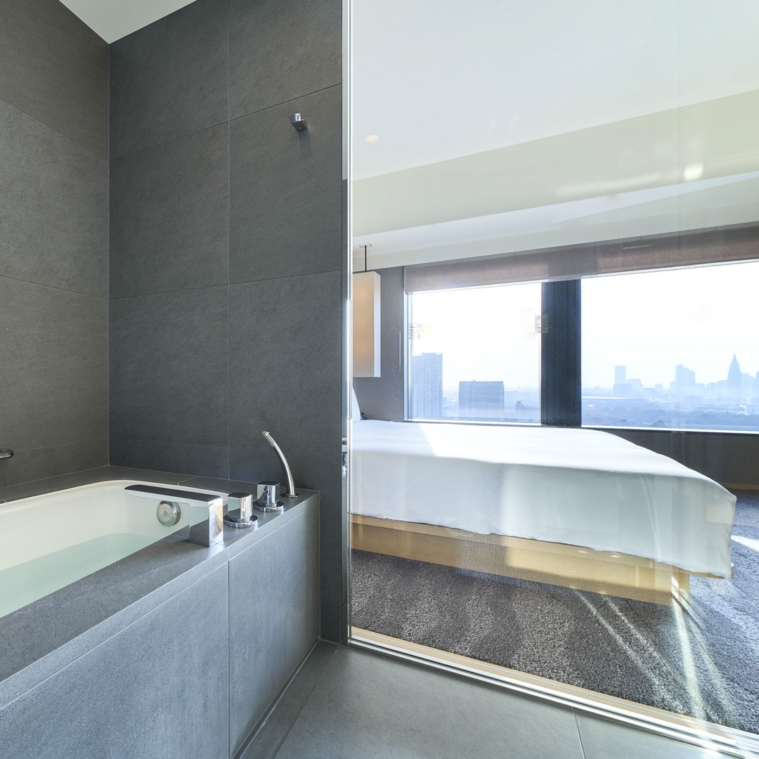 2方向の景色を贅沢にお楽しみただけるコーナールーム。窓のあるバスルームにはレインシャワーをご用意しました。