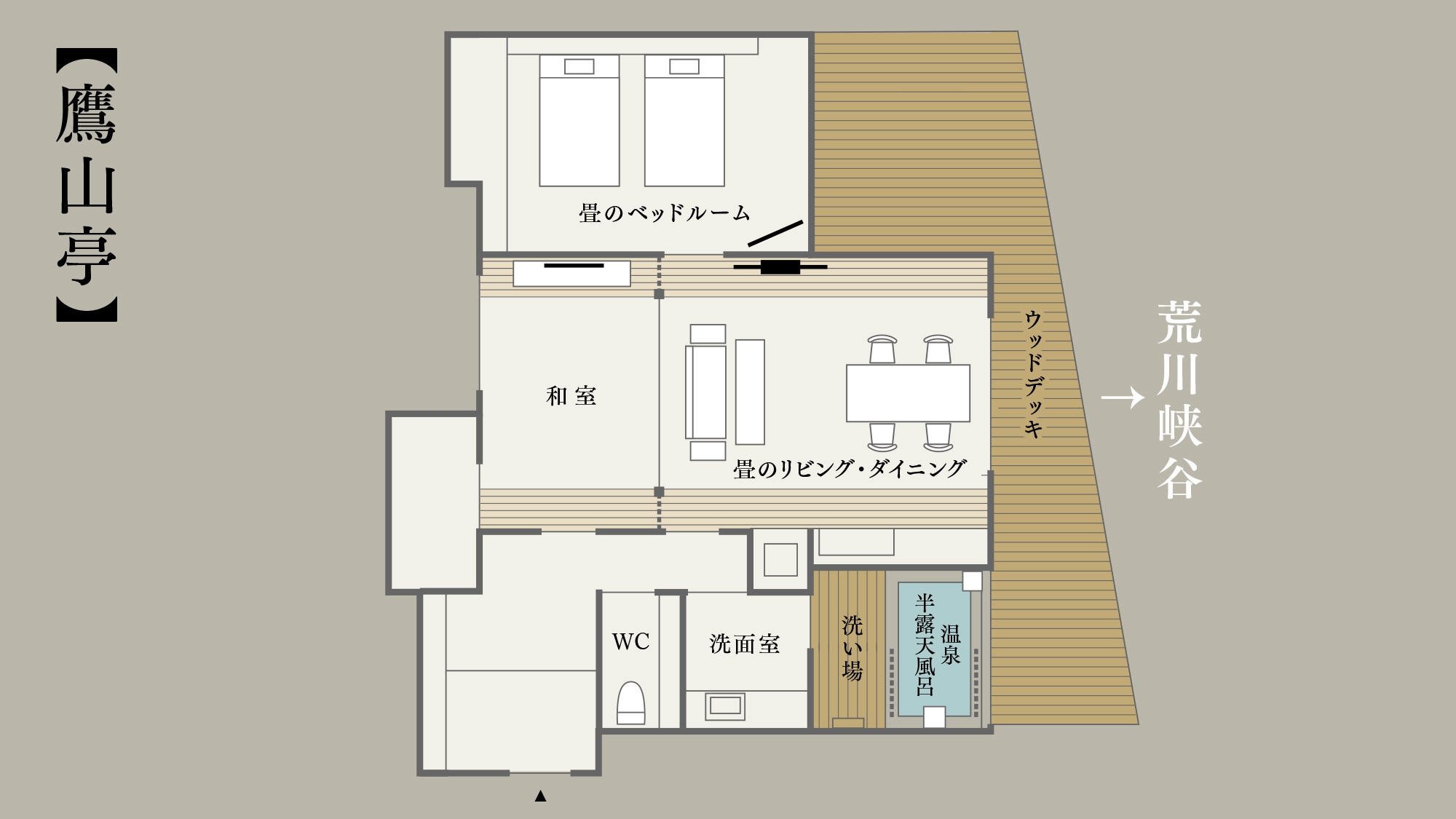 温泉露天風呂+温泉内風呂+和風ベッドルーム+和室10畳+ダイニング+ウッドデッキのお部屋。カップル・ご夫婦・ファミリーにおすすめ。