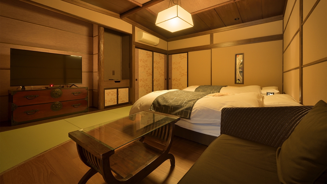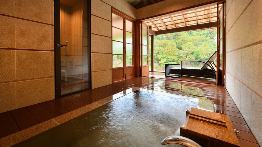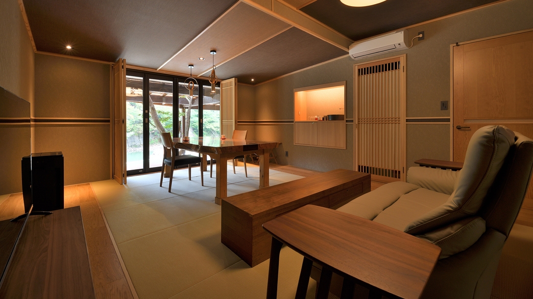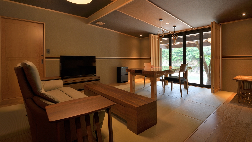 温泉半露天風呂+リビング・ダイニング+和室のお部屋。カップル・ご夫婦・ファミリーにおすすめ