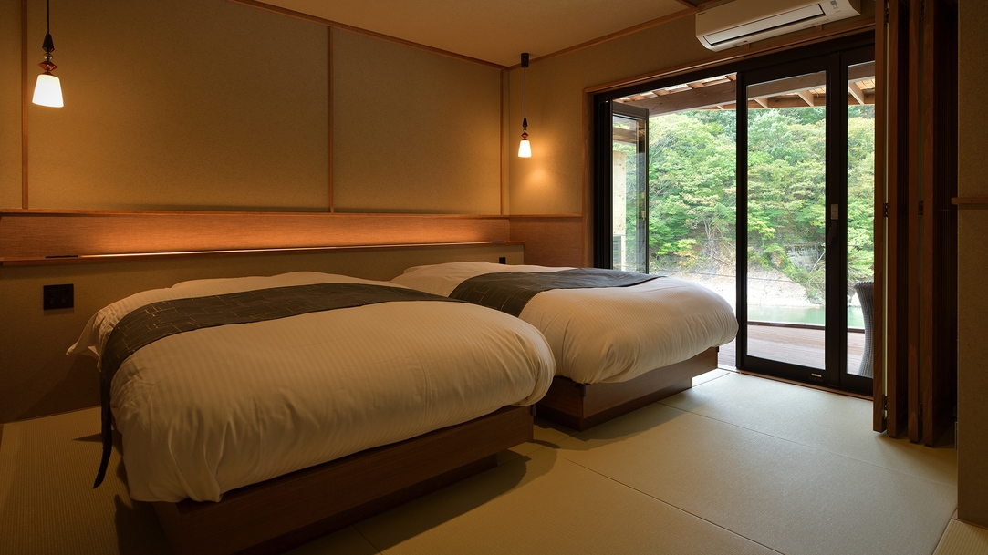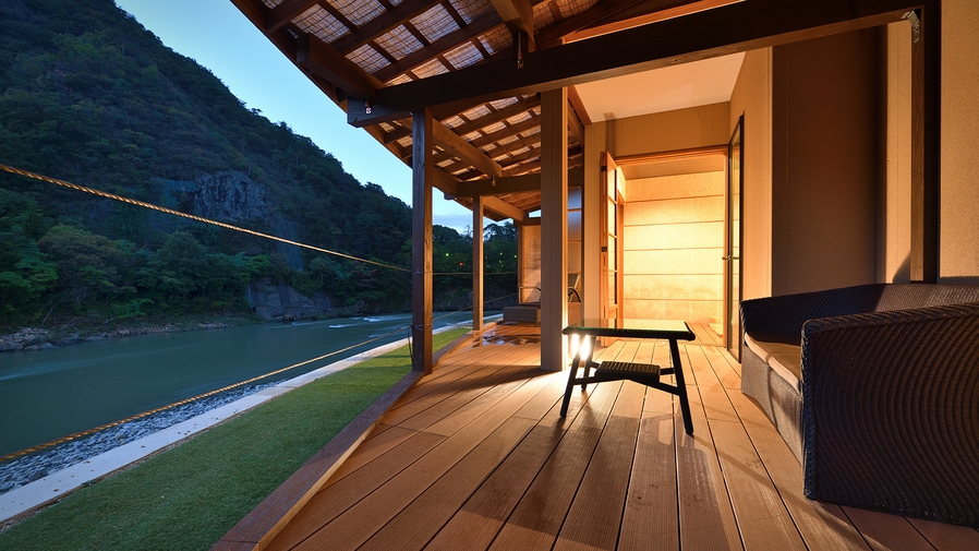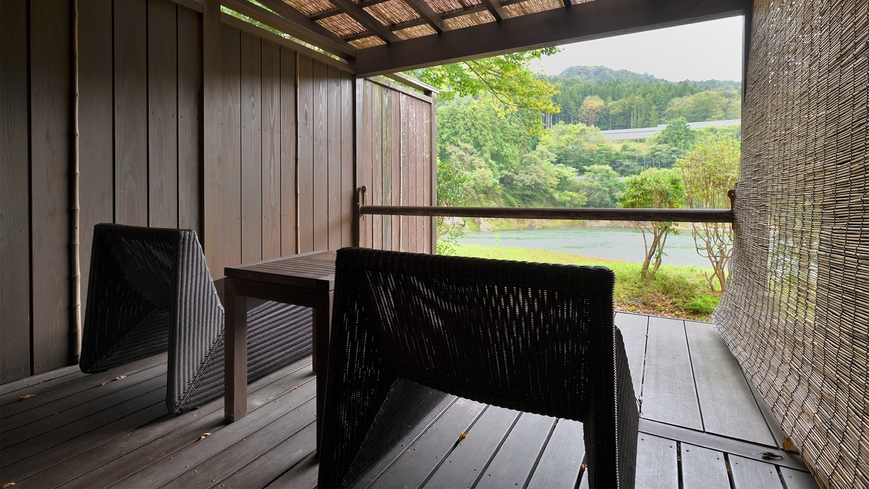 温泉露天風呂+温泉内風呂+和風ベッドルーム+和室10畳+ダイニング+ウッドデッキのお部屋。カップル・ご夫婦・ファミリーにおすすめ。