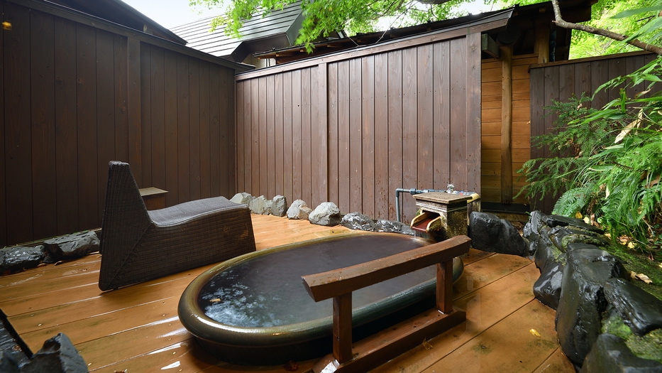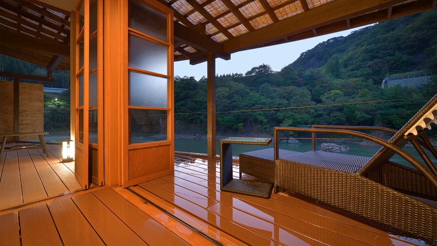 温泉露天風呂2ヶ所+温泉内風呂+リビング・ダイニング+ウッドデッキのお部屋。カップル・ご夫婦におすすめ