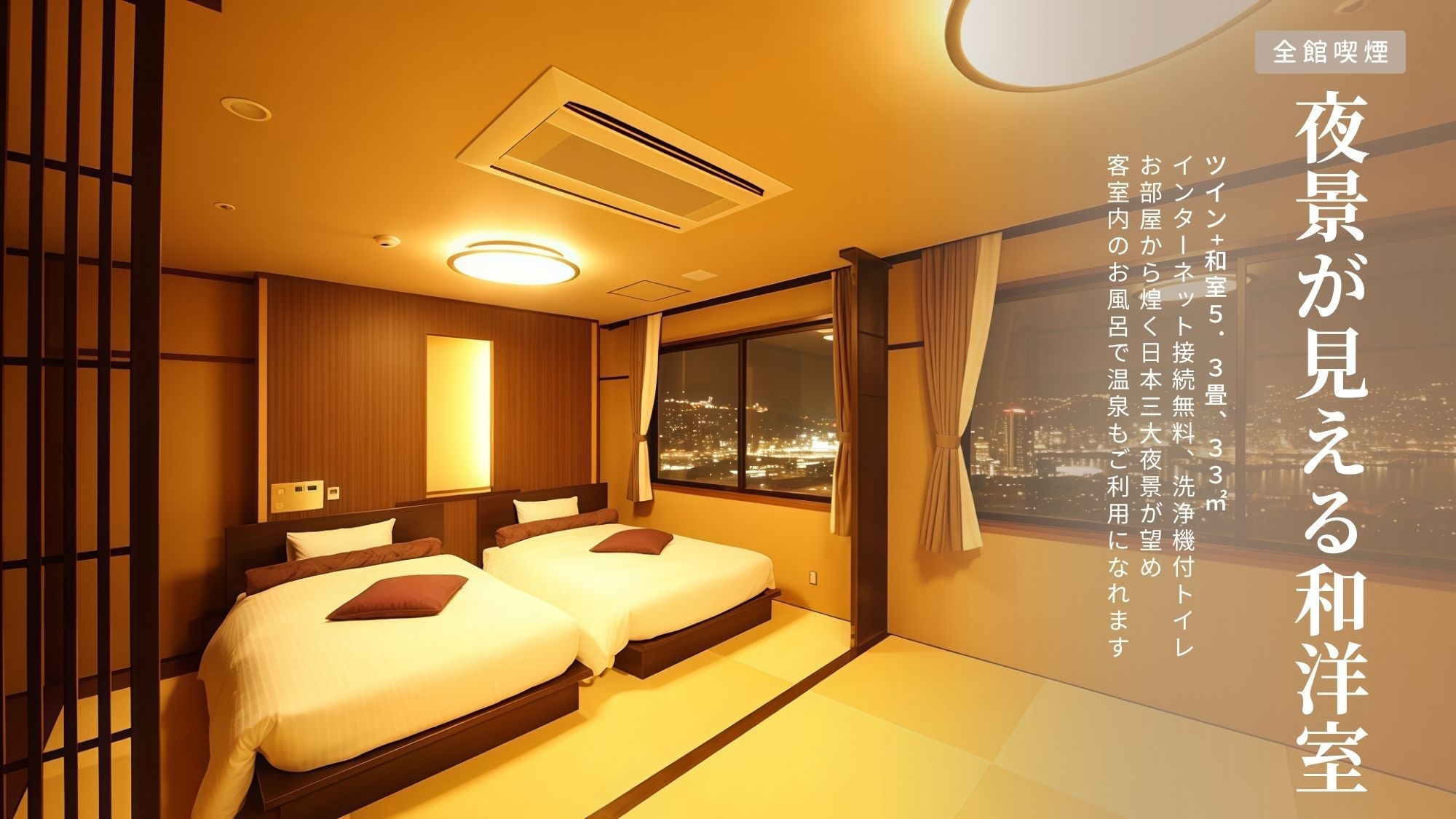 お部屋から煌く日本三大夜景が望めます。落ち着いた琉球畳の和室にベッドが配置され、ゆったりくつろげます。客室内のお風呂で温泉もご利用になれます。
