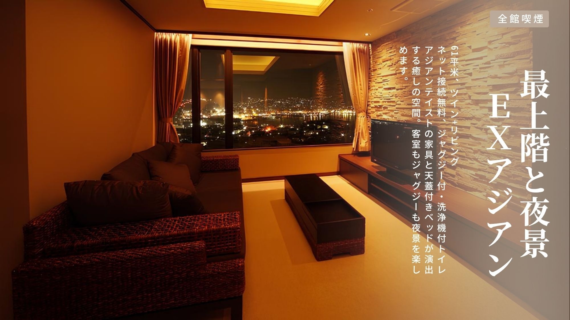 ゆったりくつろげるアジアンテイストの家具や、ロマンティックな天蓋つきベッドが、心地よいリゾート感に浸らせてくれる部屋。お部屋はもちろん、ジャグジーからも夜景が。