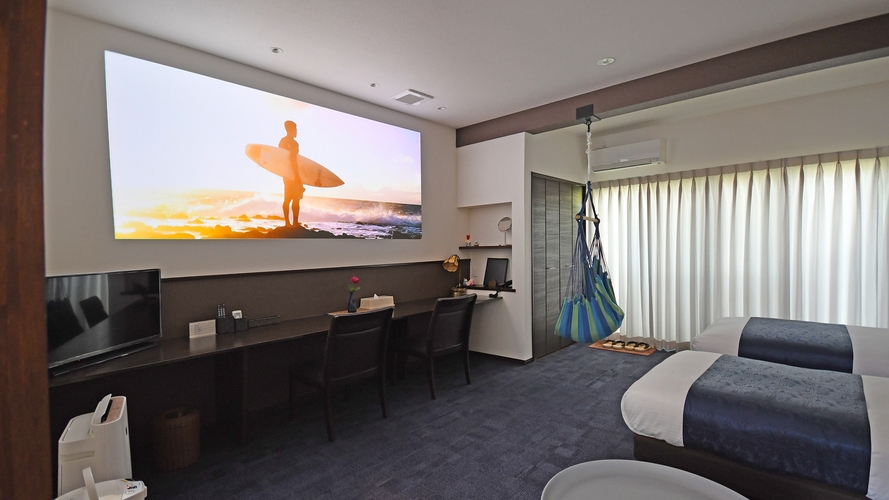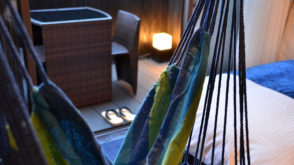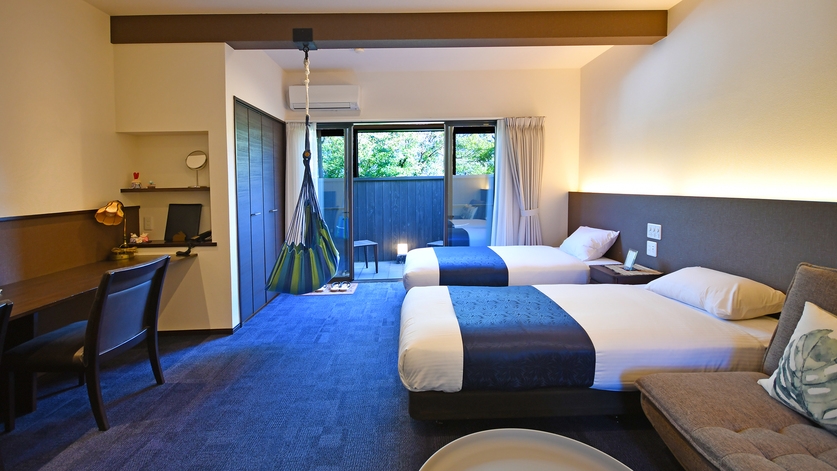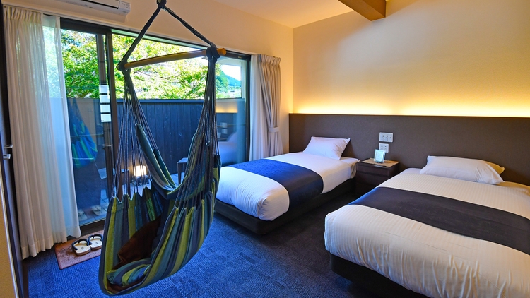 お食事は< 食事処 >でのご提供です。・シングルベッド×2台・ウッドテラス付・Bluetoothスピーカー・冷蔵庫完備