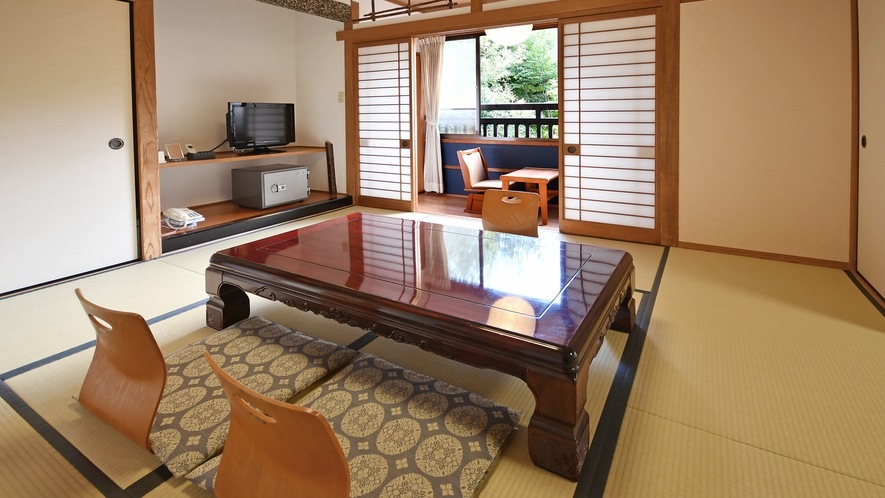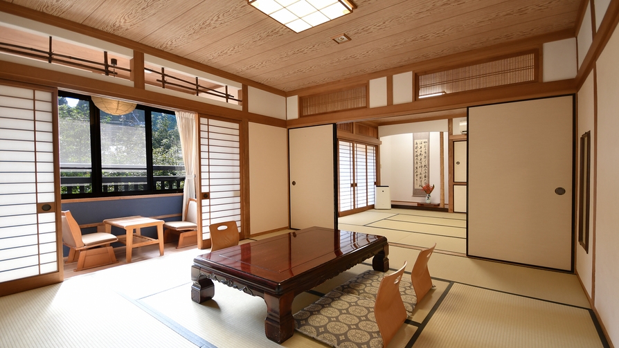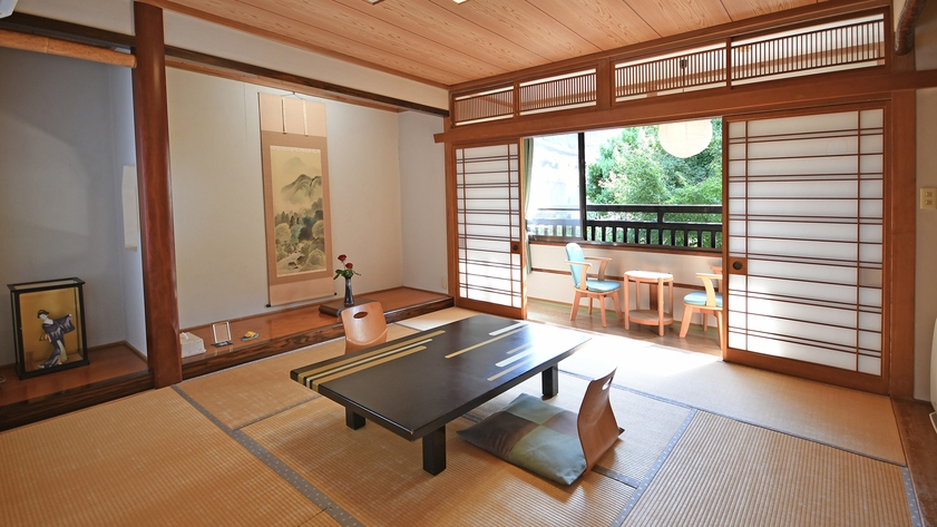 食事は< 食事処 >でのご提供です。和室12畳+6畳と、緑豊かな庭をご覧いただける広縁付です。切石で作った半露天風呂からは良質な温泉を心ゆくまでご堪能ください。