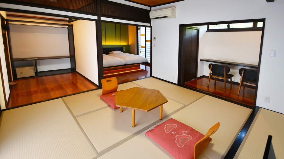 — 伝統と快適性が調和する、純和風旅館の新しいご提案 —───────────────────────────● 四季折々の風情が楽しめる純和風の佇まいを大切にした客室館内にはエレベーターがなく階段でのご移動となりますが、心身ともにゆったりお過ごしいただけるように、細やかな配慮を施しております。● バリアフリー設計を取り入れたベッドルーム付きの特別仕様。畳のぬくもりと洋の快適さが融合した空間で、足腰への負担を軽減しながら安心してお寛ぎいただけます。● 大浴場や貸切風呂と同じフロアに位置しているため、館内移動も比較的スムーズ。階段移動が必要な館内においても、入浴やお部屋への行き来がしやすい利便性の高いお部屋です。● 親子や祖父母との二世代旅行にもおすすめ。それぞれの世代が気兼ねなく過ごせるやさしい設計となっております。伝統の趣と現代の快適さが調和した空間で、大切なひとときをゆったりとお過ごしください。────────────────────■ 客室設備・和室+寝室+カウンターテーブル ※段差のないフラット設計 ・シングルベッド2台+お布団2枚(最大4名様まで) ・Wi-Fi完備・洗浄機能付きトイレ ・冷蔵庫/液晶テレビ完備 ■ オプション(貸切風呂)・「6尺酒樽貸切風呂」 1,100円/50分ご利用時間:15:00〜21:00(最終受付)・アニバーサリーケーキ4号(12cm) 3080円(税込)※ご宿泊日の3日前までに当宿までご連絡ください。 (TEL:0952−58−2101) ────────────────────■ 本プラン限定特典<モーニングコーヒーサービス>若旦那こだわりの挽きたて珈琲をご用意。ご朝食後は喫茶ルームにて、ホッとひと息お楽しみください。────────────────────■ お食事(食事処にて)【夕食】佐賀牛の中でも希少な「イチボ」部位を使用した石焼をはじめ、山の幸や旬の食材を盛り込んだ、板長厳選のグルメ会席をご用意。【朝食】地元の食材を使った和朝食。特にこだわりの海苔は宿の一押しです。