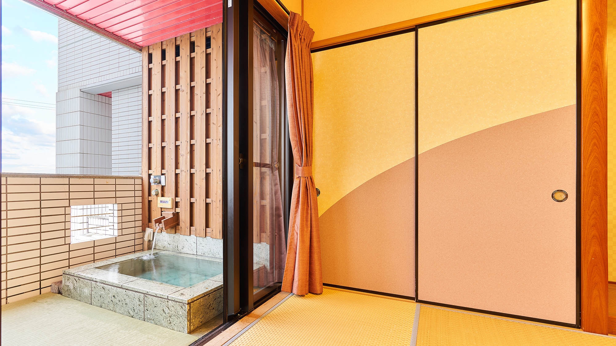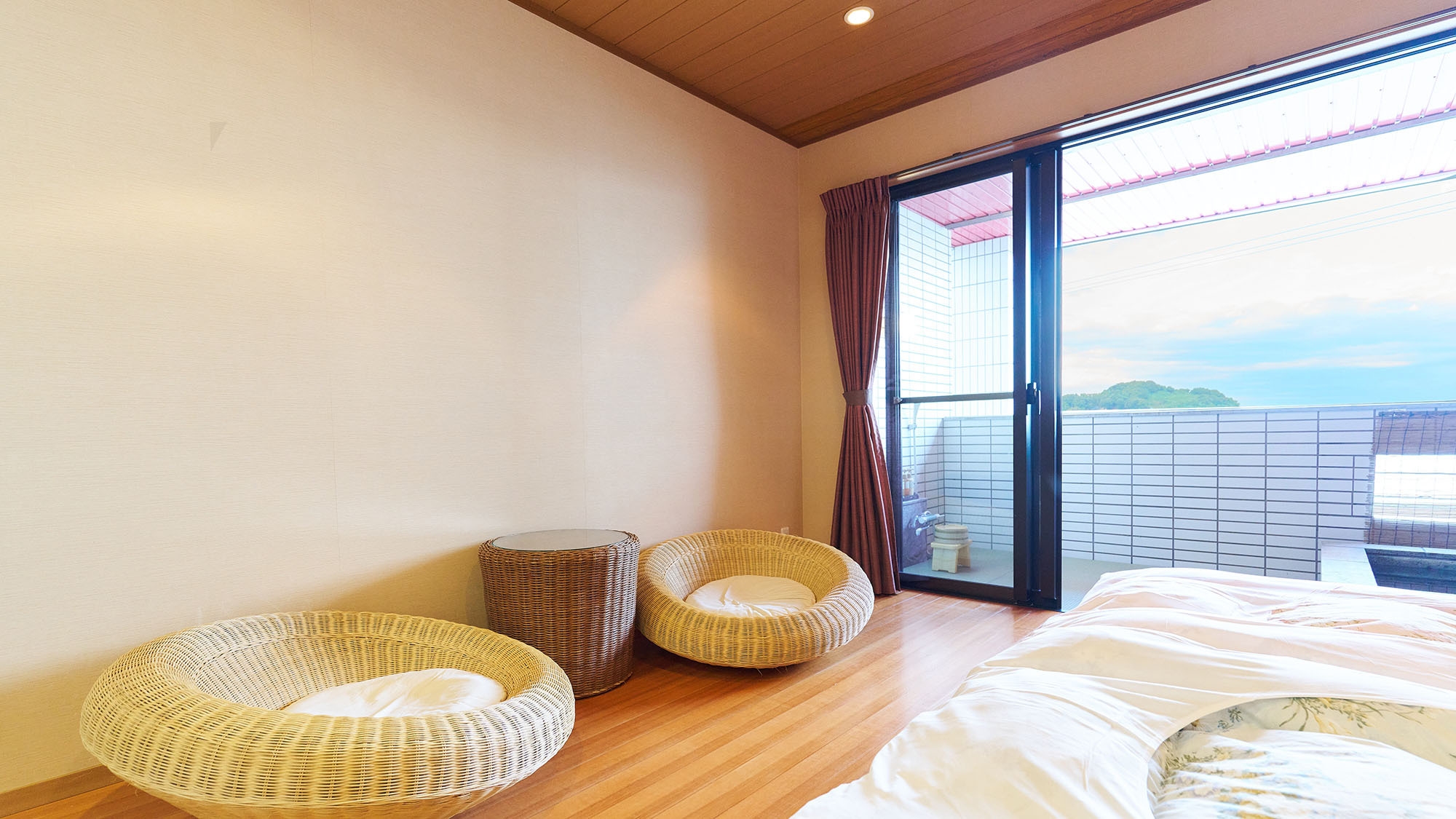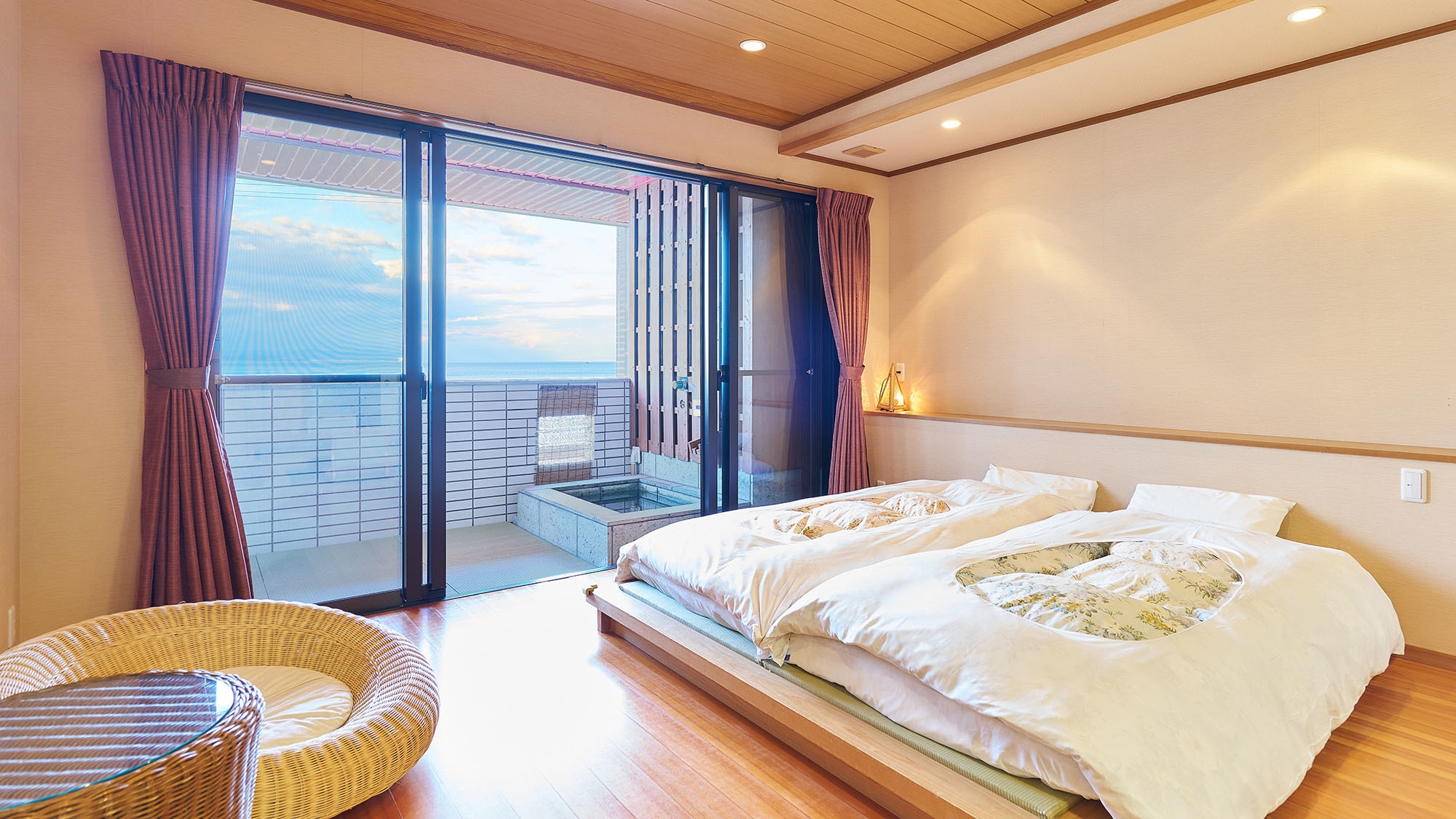 和室12畳+洋室10畳(ベッドルーム)。バルコニーに設置されている露天風呂より海を眺めながらご入浴いただけます。大工が製作した特注の木製畳ベッドを設置