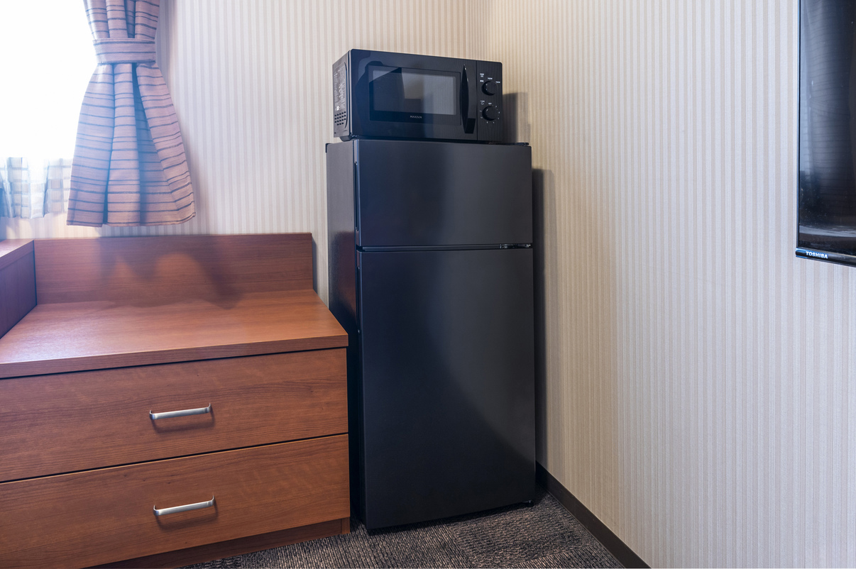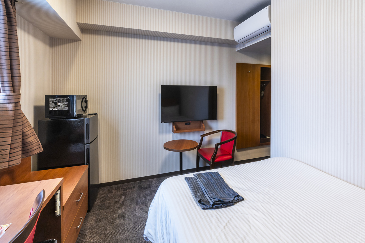 部屋設備・備品ダブルルームの客室に冷凍機能付き冷蔵庫と電子レンジ、2段チェストがプラスされてタイプの客室です。 寝具マットレスはシモンズ製、シノプルで使いやすい客室。
