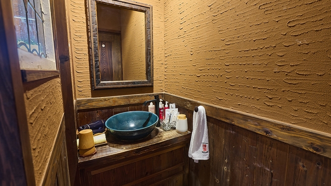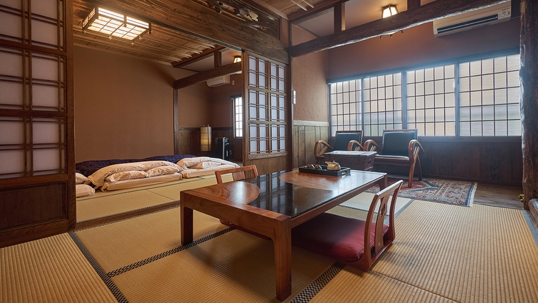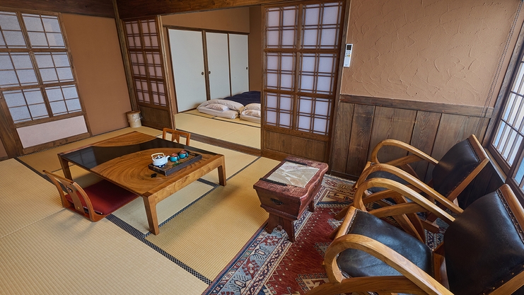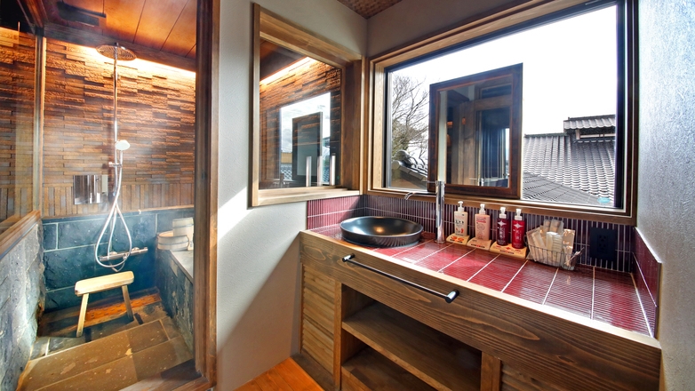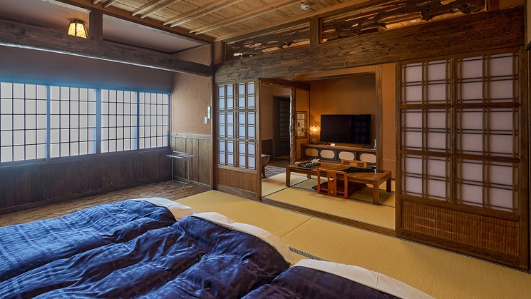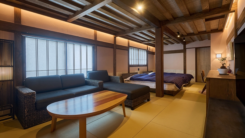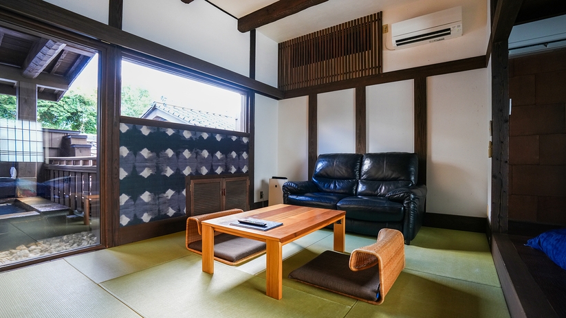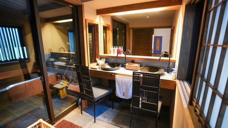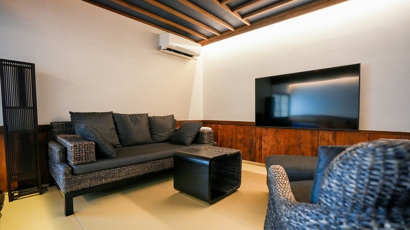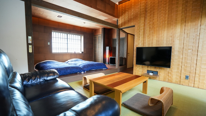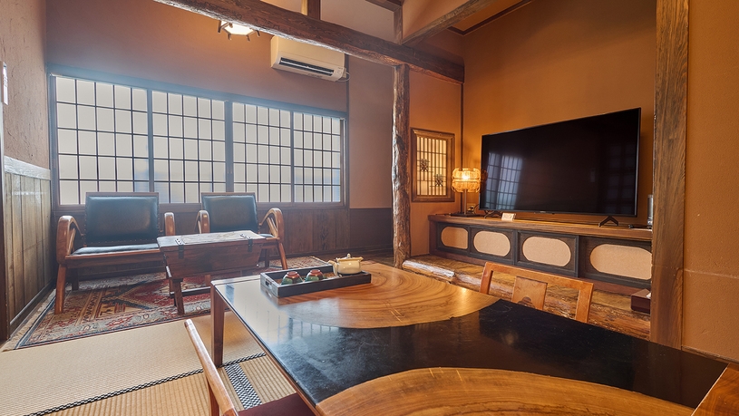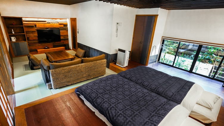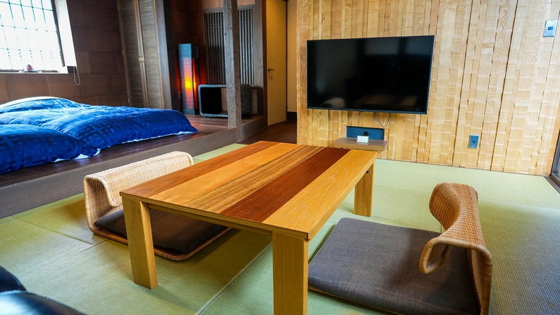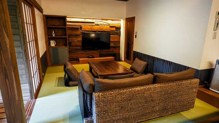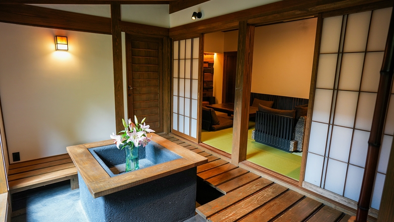 客室専用内湯岩風呂付き 床暖房完備 土間8畳+10畳和室+板張り8畳 《トイレ・洗面付き・55型4Kテレビ完備•DVD(映画ソフト貸し出し無料)》