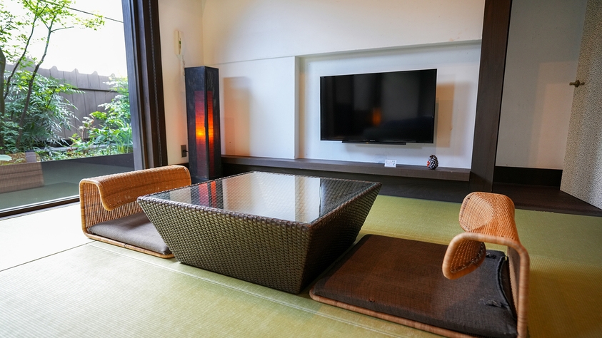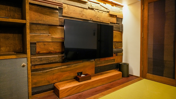 24時間かけ流しの専用露天付/洗面・トイレ(ウォシュレット付)/液晶テレビ55型 和紙をモチーフにした、落ち着いた雰囲気のある客室です。