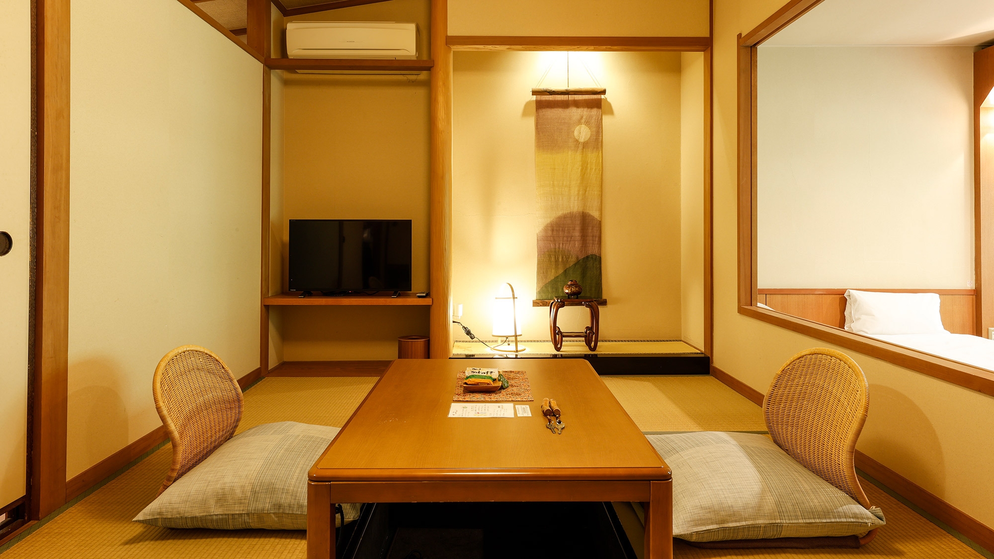 2024年オープンの檜風露天風呂付き和洋室。和室とシングルベッド2台を設置した洋室があり、ゆったりとした和洋室タイプ(禁煙室)。