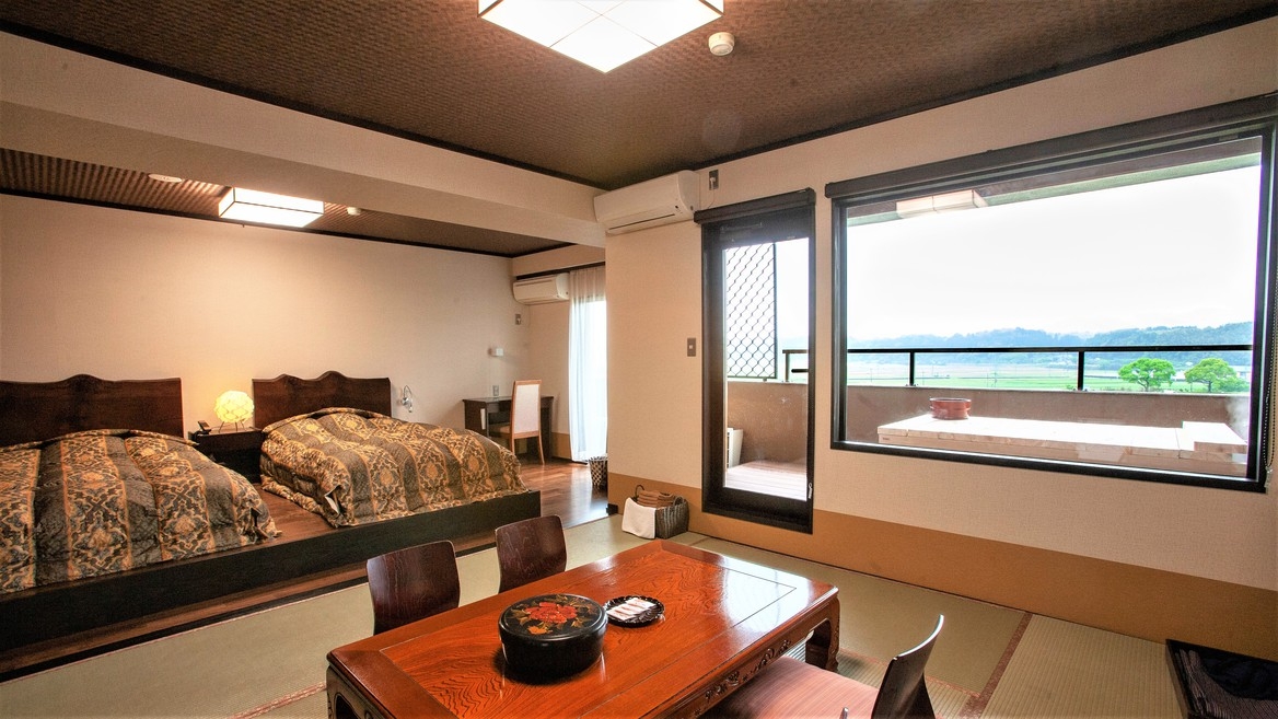 最上階の菊池川を望む、露天風呂付き和洋室。※客室のお風呂(露天風呂含む)につきましては温泉ではございません。