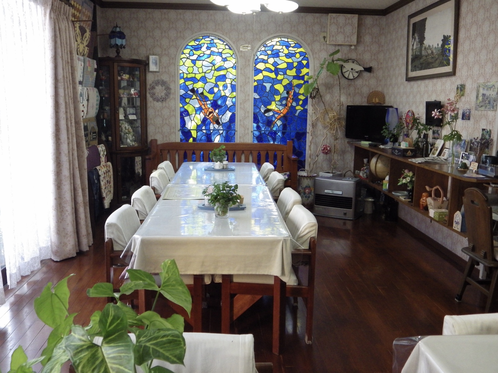 花々のガーデンを前に朝のステンドグラスの光の中、サラダとコーヒ又は紅茶の朝食をお楽しみ下さい.トールペイント、パッチワーク、絵画など 芸術に溢れる伊豆高原のお宿。緑に囲まれ、南方向に城ヶ崎海岸が望め、日によっては伊豆7島の利島も。 宿の女将は自転車で日本一周もしたことがある、元サイクリスト。 自転車のことに関して何かございましたらお気軽にご相談ください。お支払いは現金のみ。花の都しずおか花緑コンクール・宿泊施設の部 優秀賞受賞(平成29年度)
