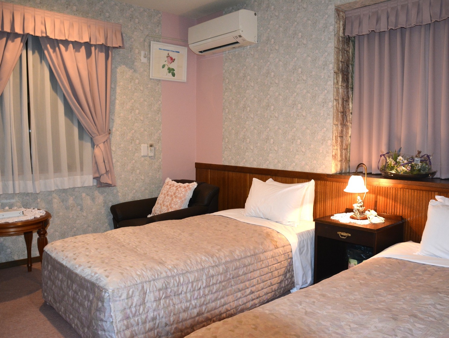 英国製クラシック家具の並ぶゆったり広めのお部屋タイプ。カップル、ご夫婦、お友達同士にお勧め。お茶セット、ユニットバスorシャワーブース、トイレ洗面台、冷蔵庫付