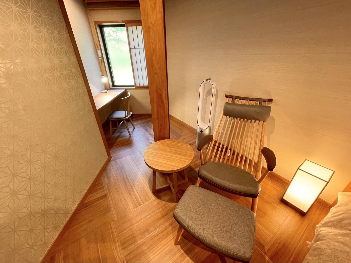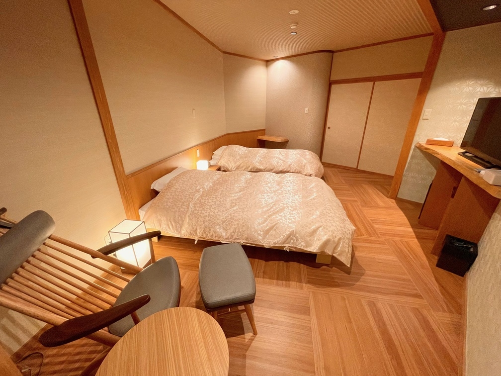 令和6年リニューアル!新しく広いお部屋。内装と家具は倉橋建築計画事務所竹内慶和氏のデザインセンスが光ります。ベッドは信頼の日本製・フランスベッドのセミダブル。