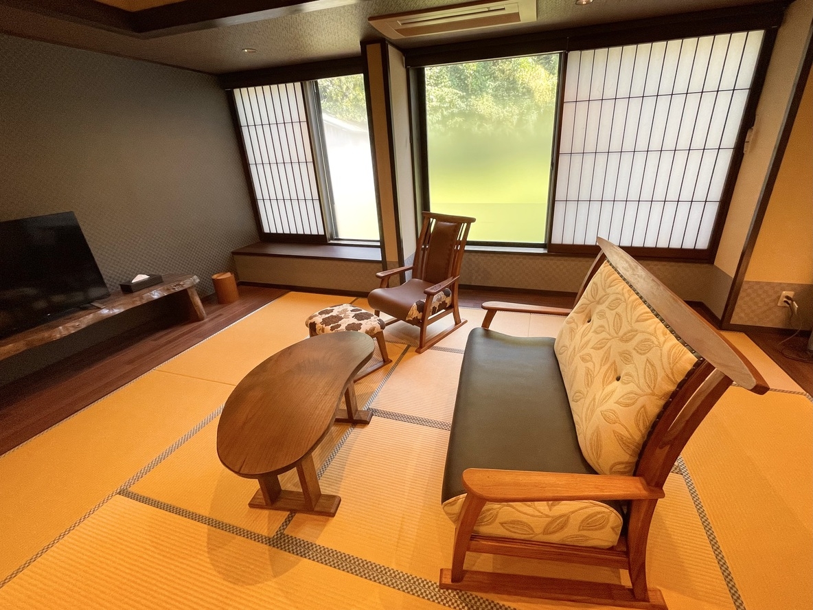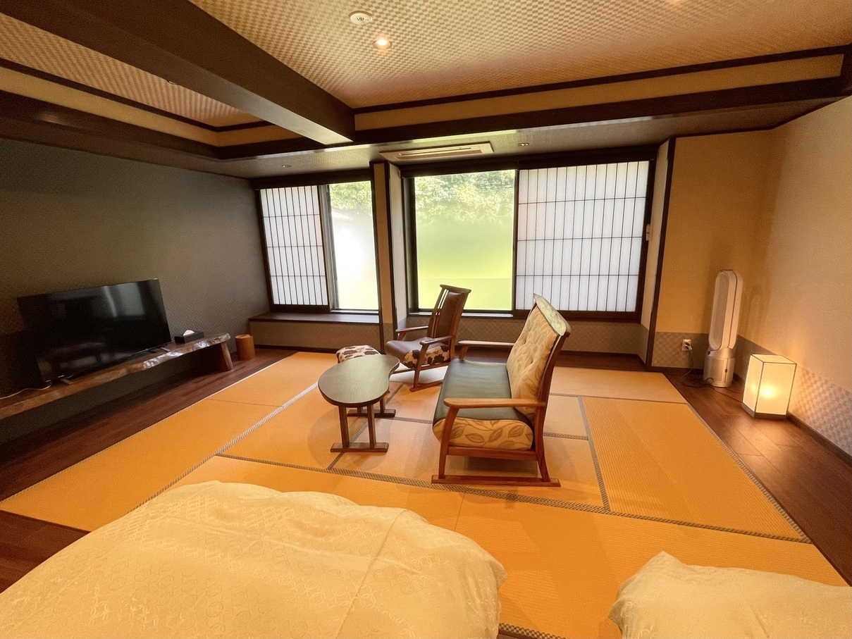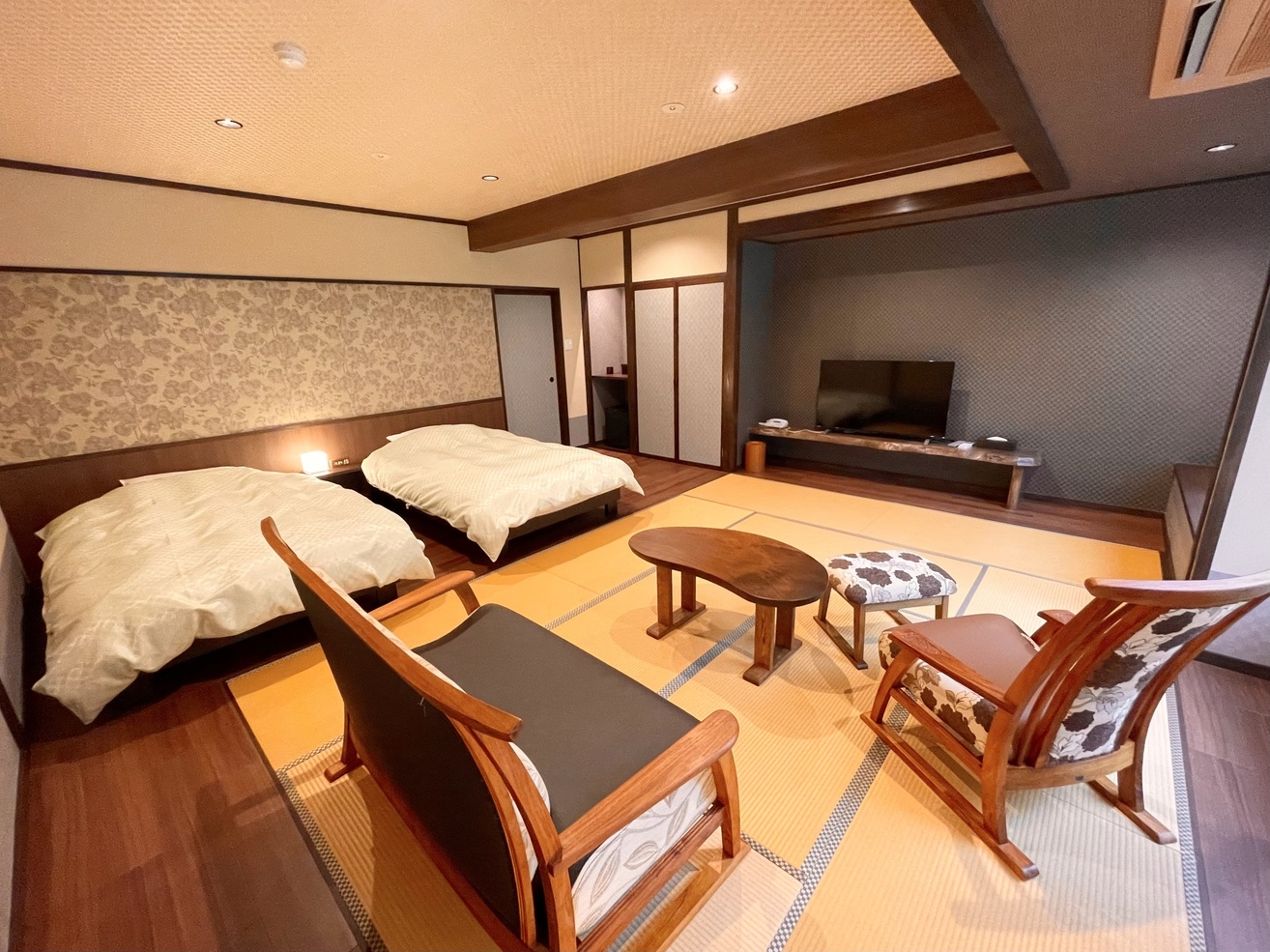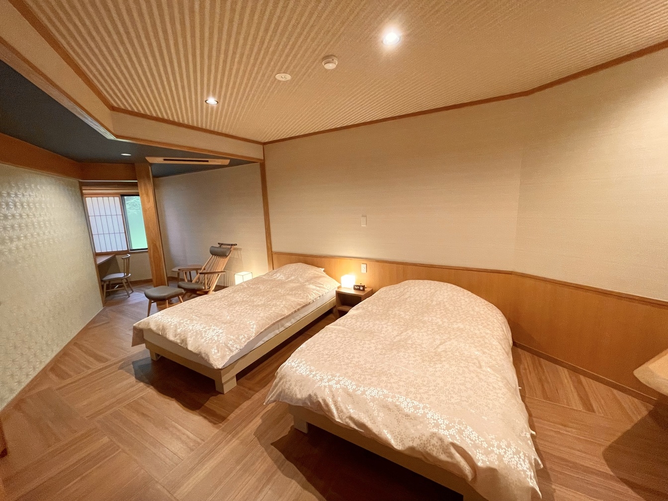 上階(寝室)が10畳の和室、下階(リビング)が8畳の和室で2階建ての構造。上と下に分けて寝具を用意可能。温泉風呂と洗面が上階。トイレ、テレビ、冷蔵庫等は上下階。