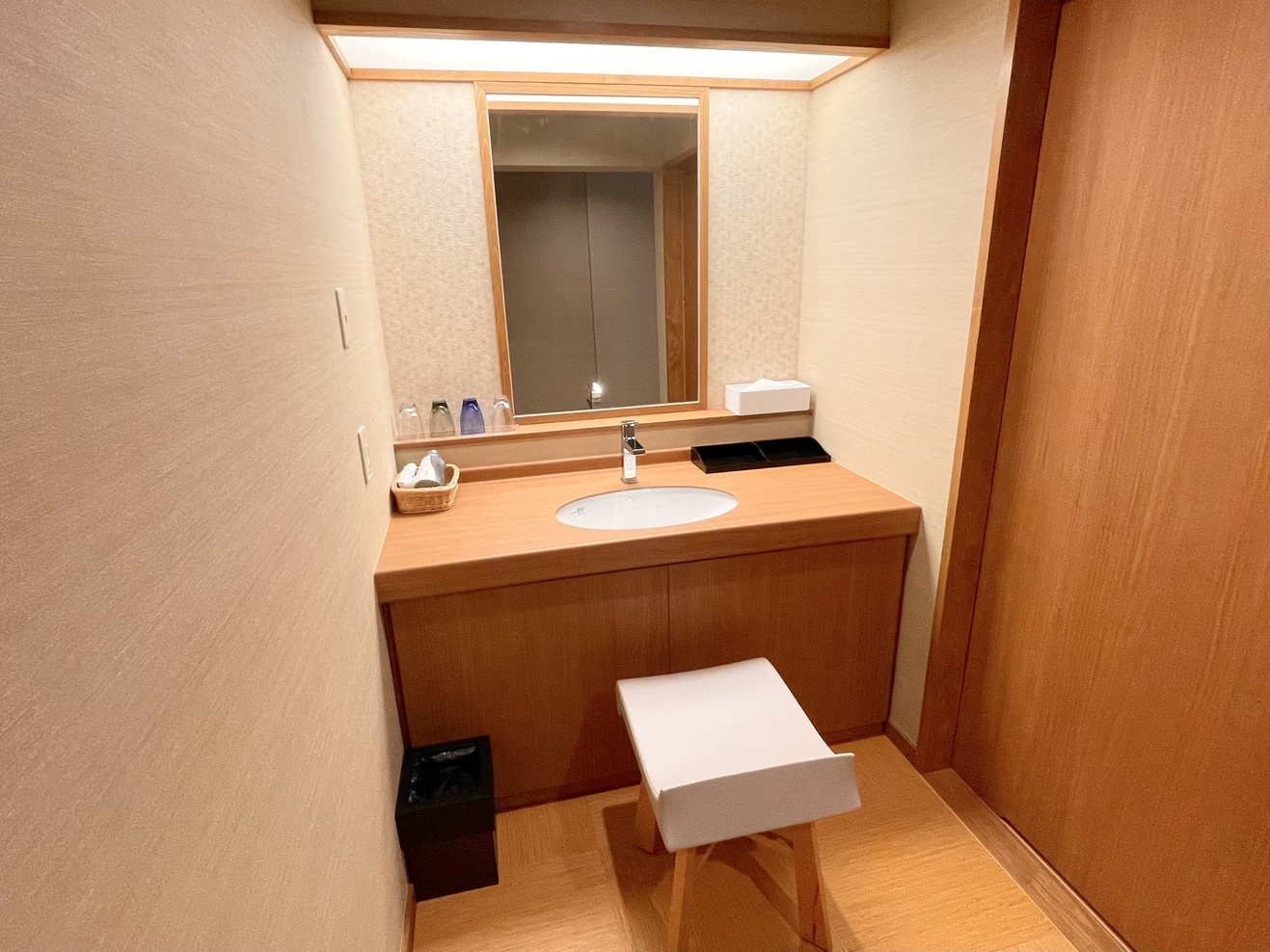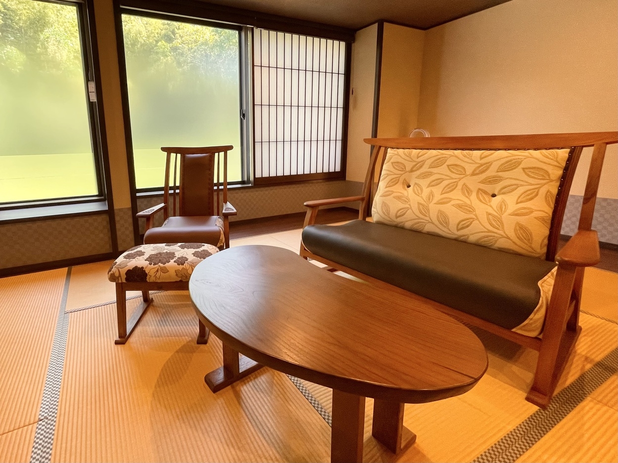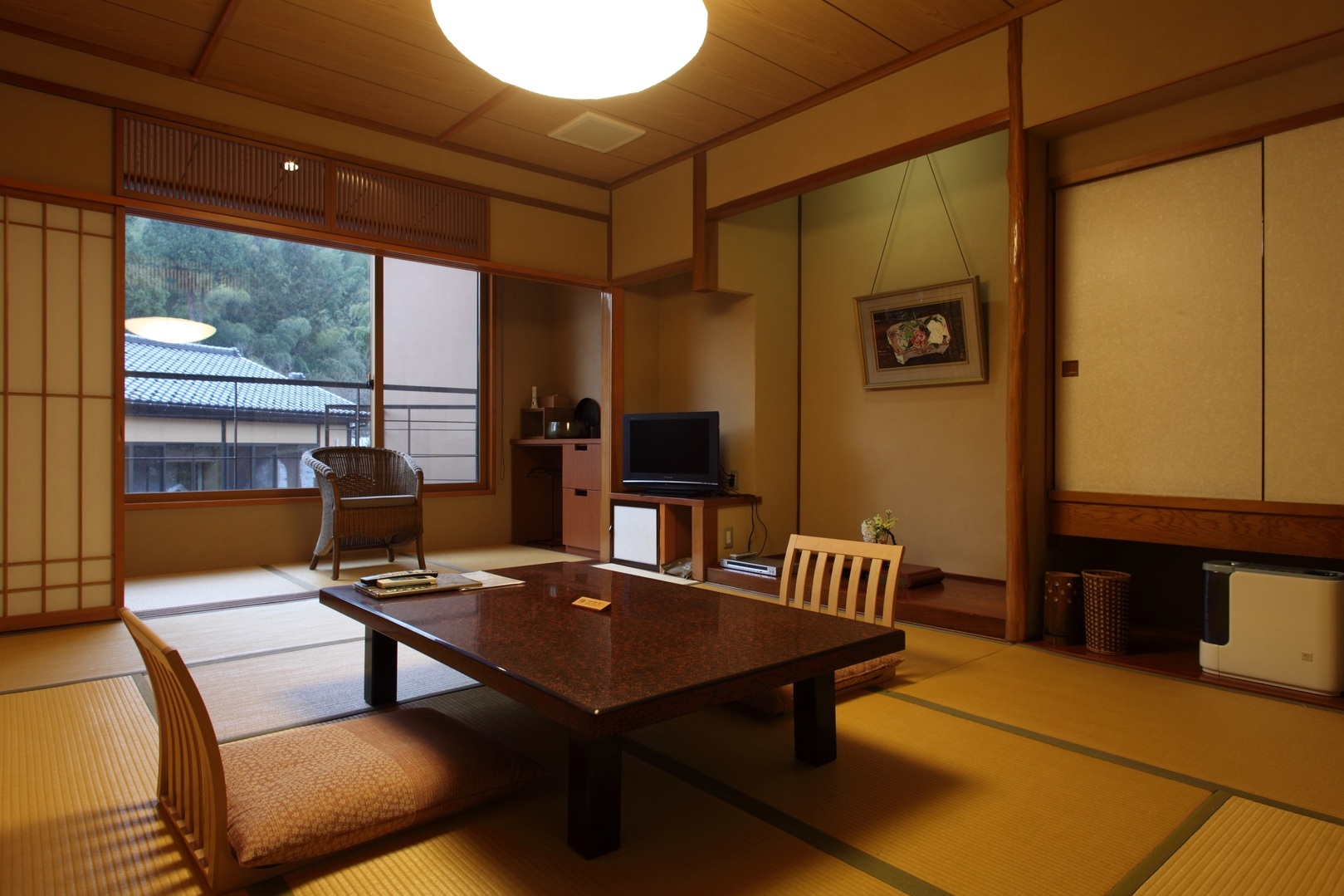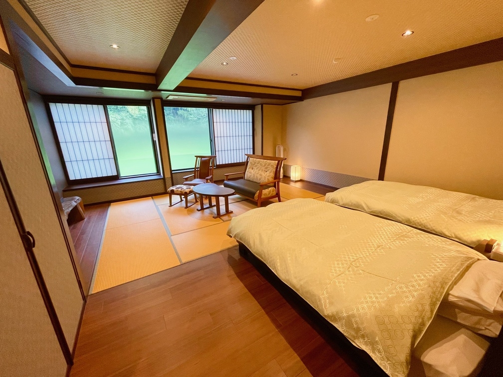上階(寝室)が10畳の和室、下階(リビング)が8畳の和室で2階建ての構造。上と下に分けて寝具を用意可能。温泉風呂と洗面が上階。トイレ、テレビ、冷蔵庫等は上下階。