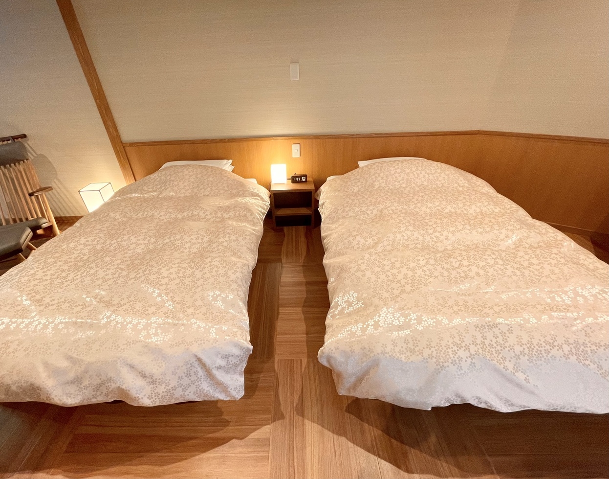 上階(寝室)が10畳の洋室、下階(リビング)が8畳の和室で2階建ての構造。上と下に分けて寝具を用意可能。温泉風呂と洗面が上階。トイレ、テレビ、冷蔵庫等は上下階。