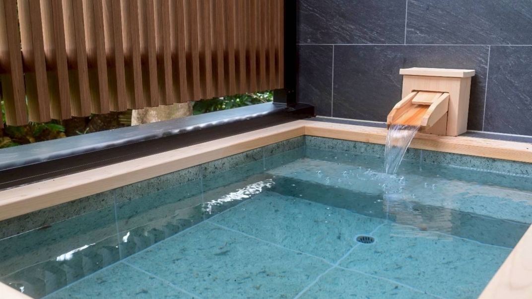 竹林の池に望み静寂のひとときの中、ゆったりとした時間が流れます。 露天風呂は、内湯とは別に約7畳のデッキに2畳位の大きさの湯船になり源泉かけ流しの天然温泉です。