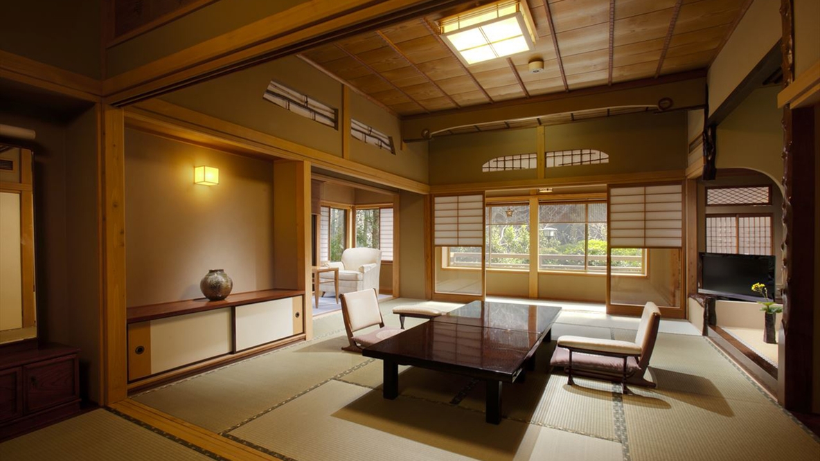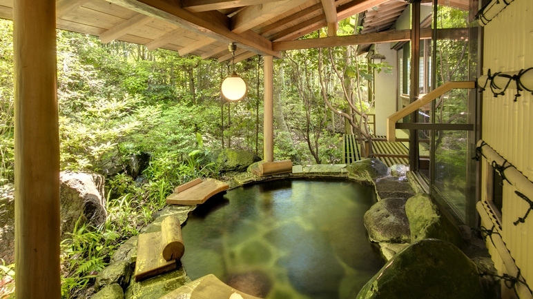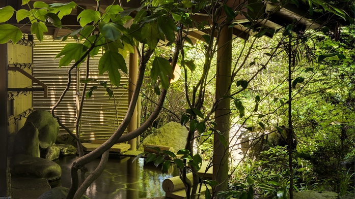 2間と広縁の造りは1室50坪余の数奇屋造のお部屋です。 竹林を望み静寂のひとときの中、ゆったりした時間が流れます。源泉かけ流しの天然温泉になります。
