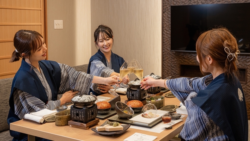 お食事はプライベートを重視したお部屋食で、さらに夕食時にはドリンクが無料・飲み放題となる嬉しい特典付き。誰にも邪魔されない極上の空間で、心ゆくまでお食事と美酒をご堪能いただけます。
