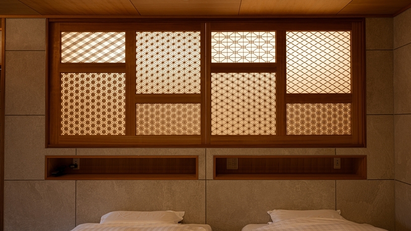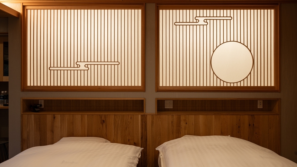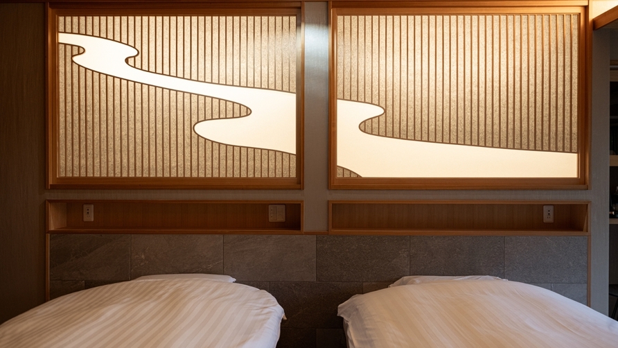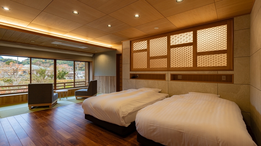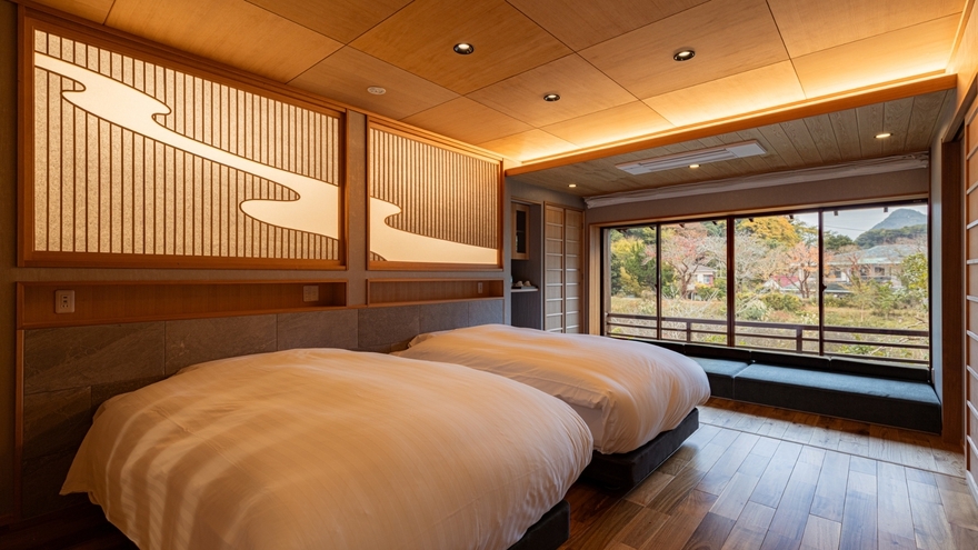 ツインベットと川のせせらぎが聞こえる半露天風呂付き客室「東館」 ※1泊2食の場合 ご夕食・ご朝食共にお食事処でのご用意となります。