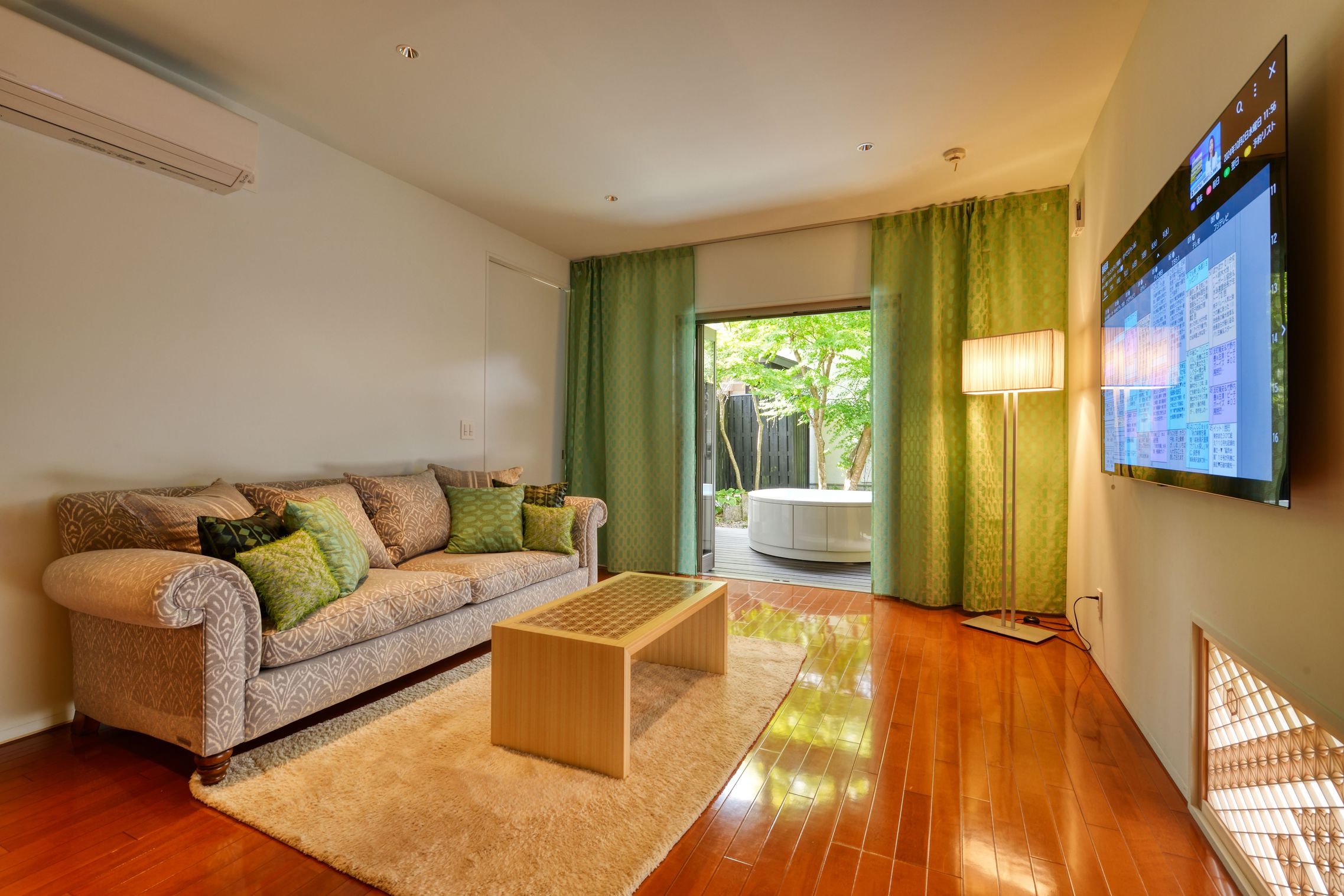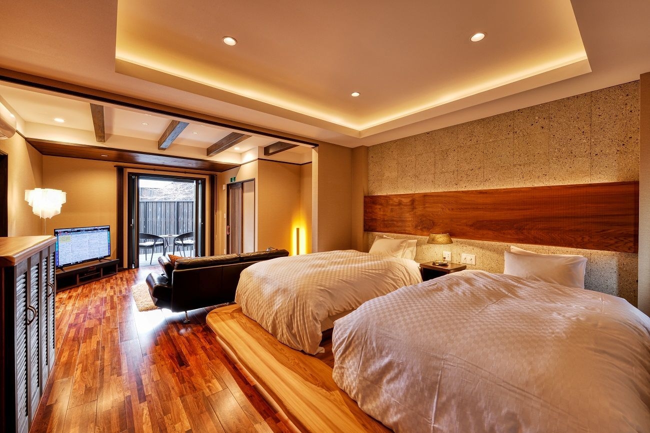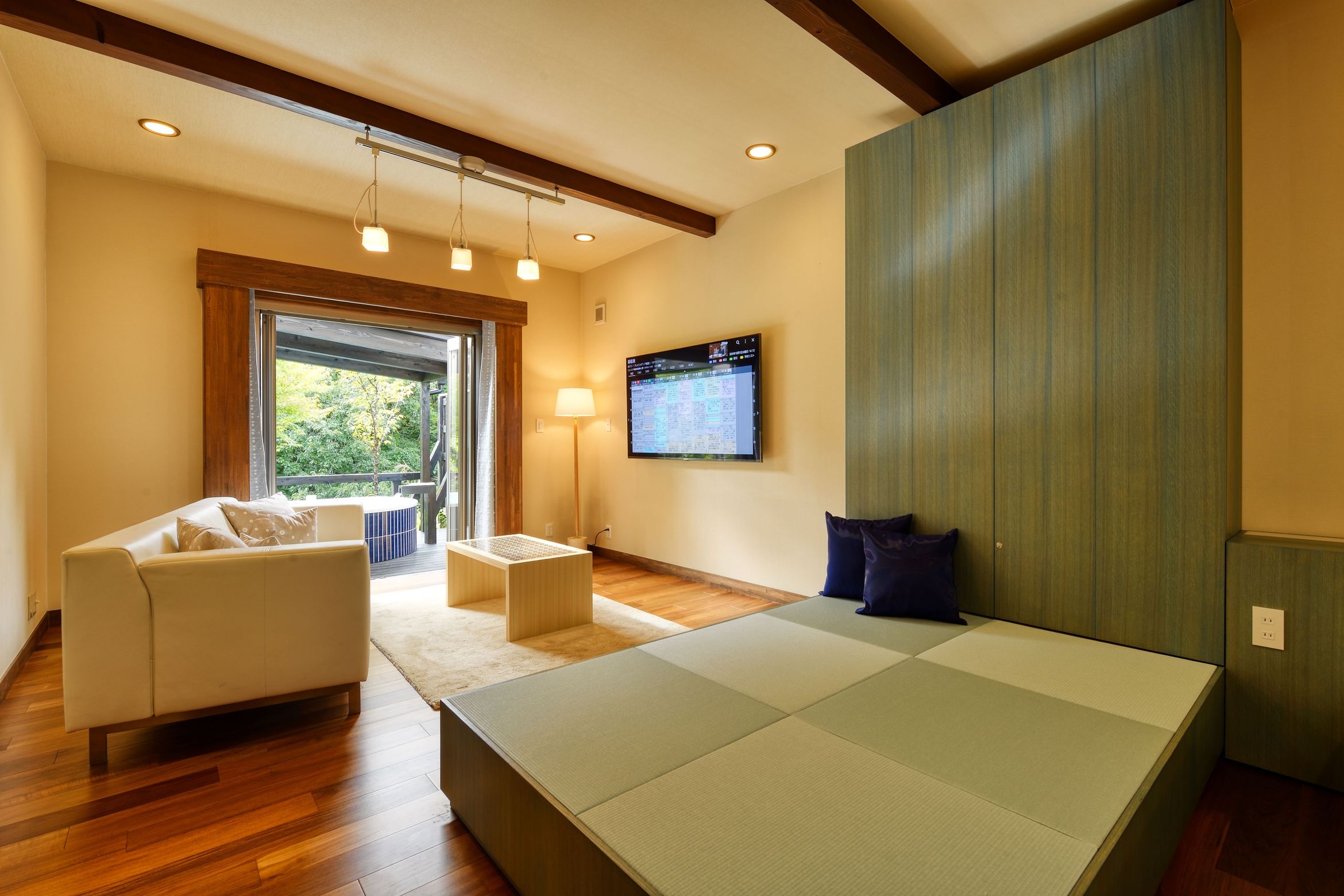 2つの温泉露天風呂が贅沢!木の質感が温かい雰囲気を醸し出す・・・カッシーナのヴィンテージソファやインテリアが高級感溢れる空間に。キングサイズのベッドも快適。