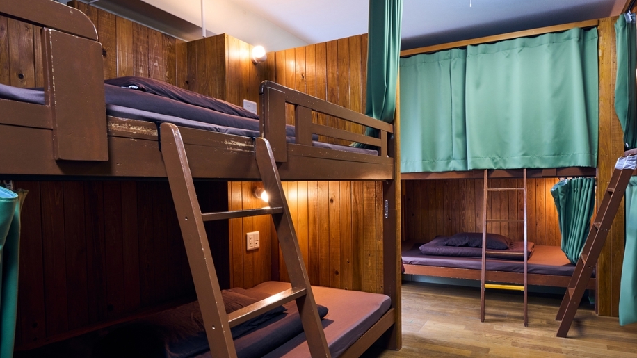 二段ベッド、ベッドカーテン、読書灯、エアコン、バルコニー付き。館内にセキュリティボックスがあります。2022年10月にリニューアルされました!
