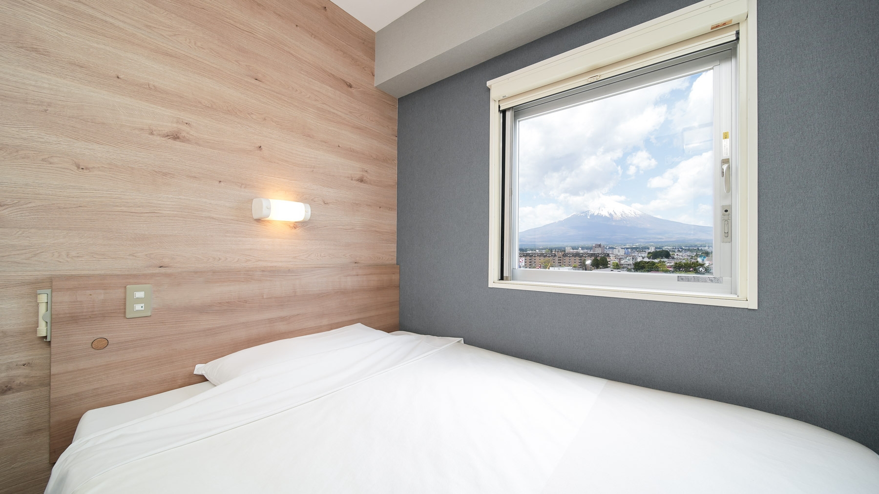 お部屋の窓から富士山が見える【富士山ビュールーム】です。 150cm幅のダブルサイズのワイドベッドでぐっすりお休み下さい。