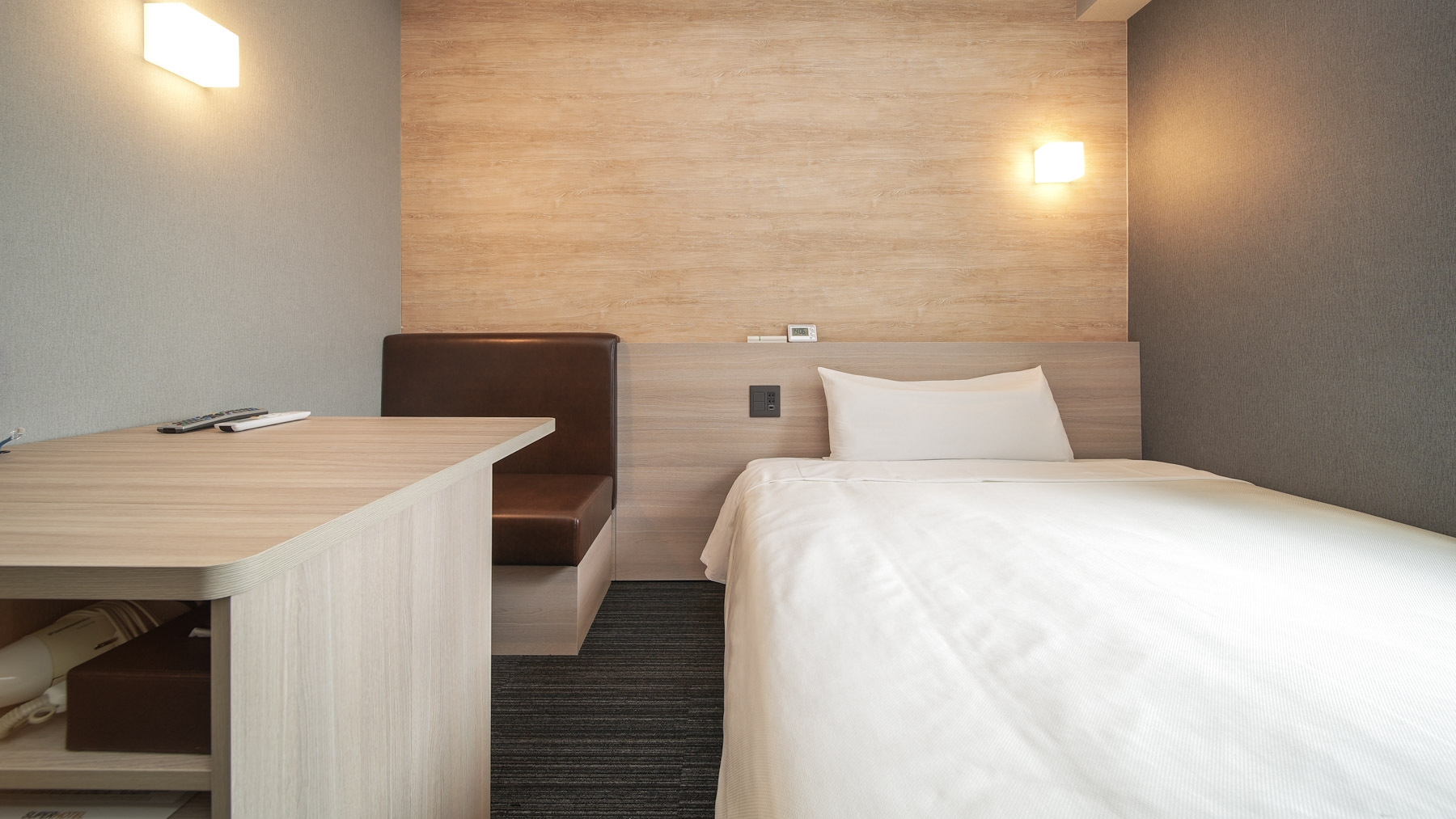 2023年3月リニューアル済!150cm幅のワイドベッド+広々デスクの【エクストラルーム】です。 広々デスクで仕事や作業がしやすいお部屋です。