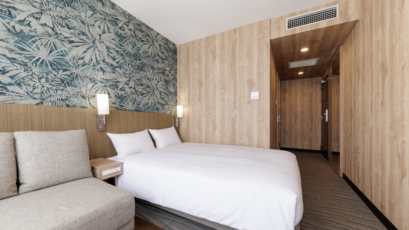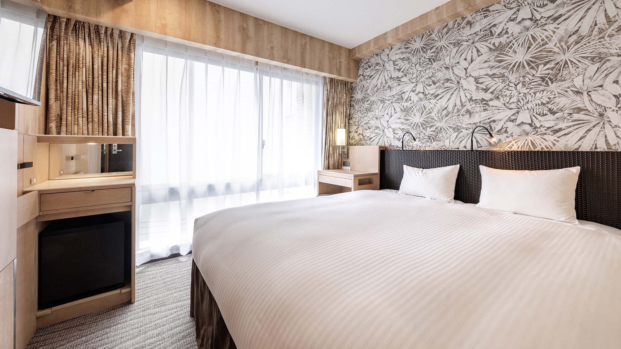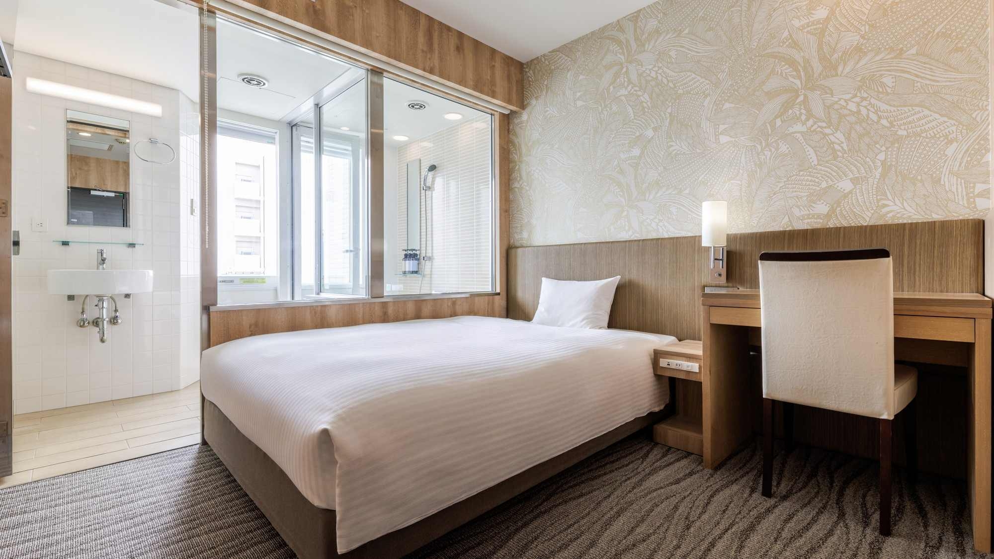 13.6平米、シモンズ社製ダブルベッド1台(幅:約140cm)室内バスルーム:ユニットバスタイプ。2名利用時には1台のベッド(140cm幅)でのご利用とります。