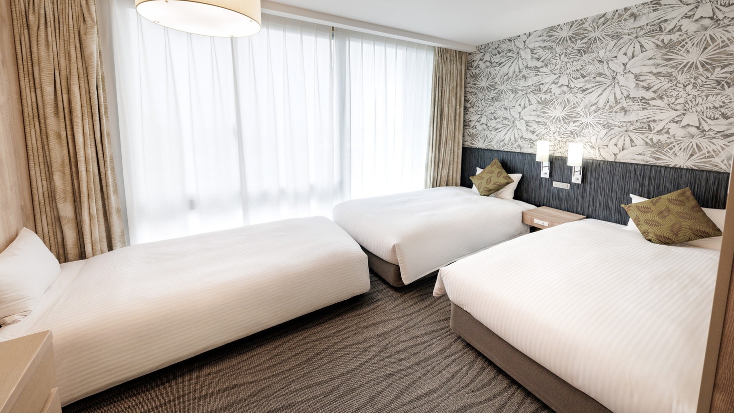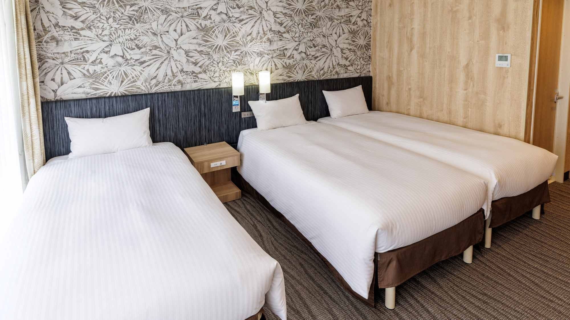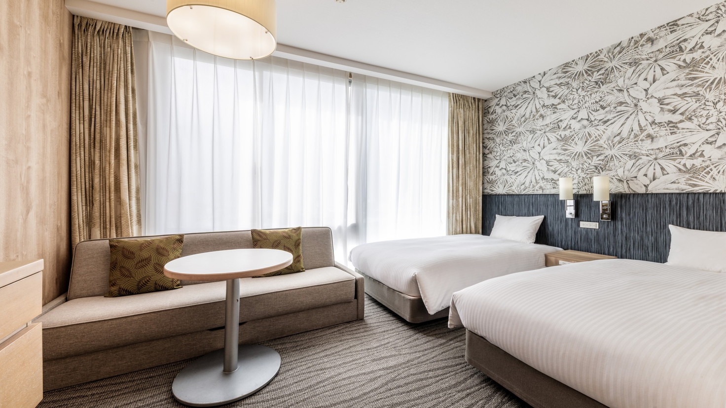 20.4平米のお部屋にシモンズ社製ベッド2台(幅:約110cm)+ソファベッド1台、室内バスルーム:ユニットバスタイプ