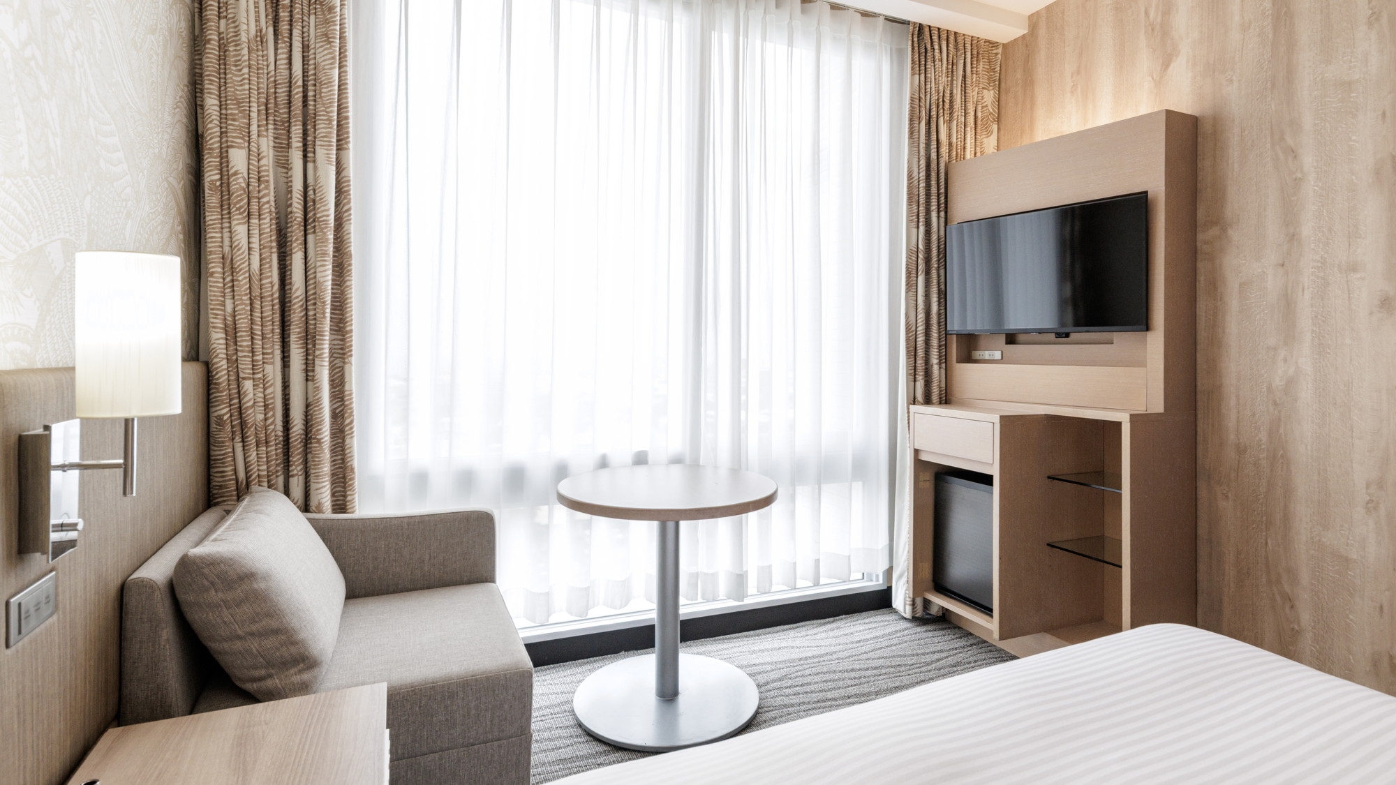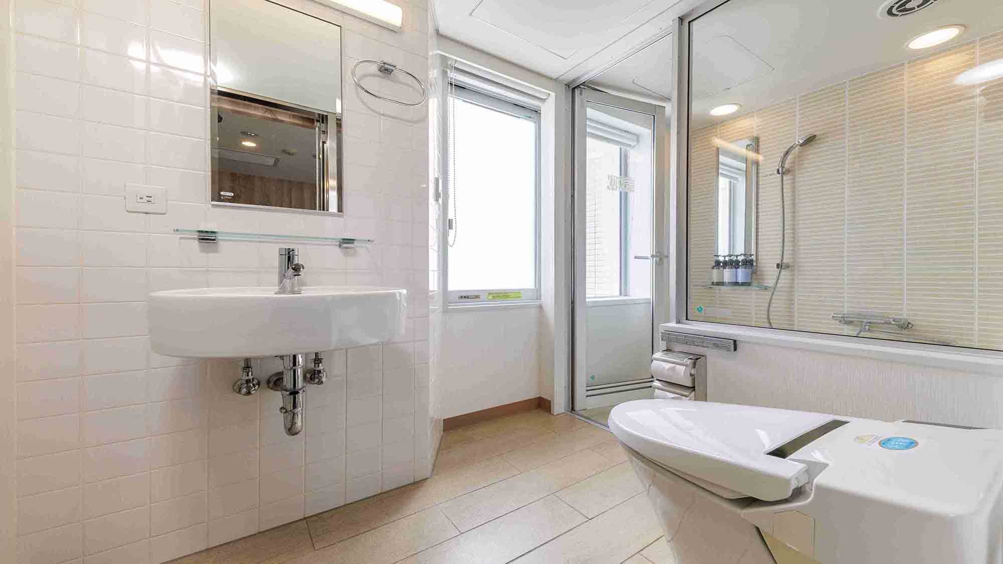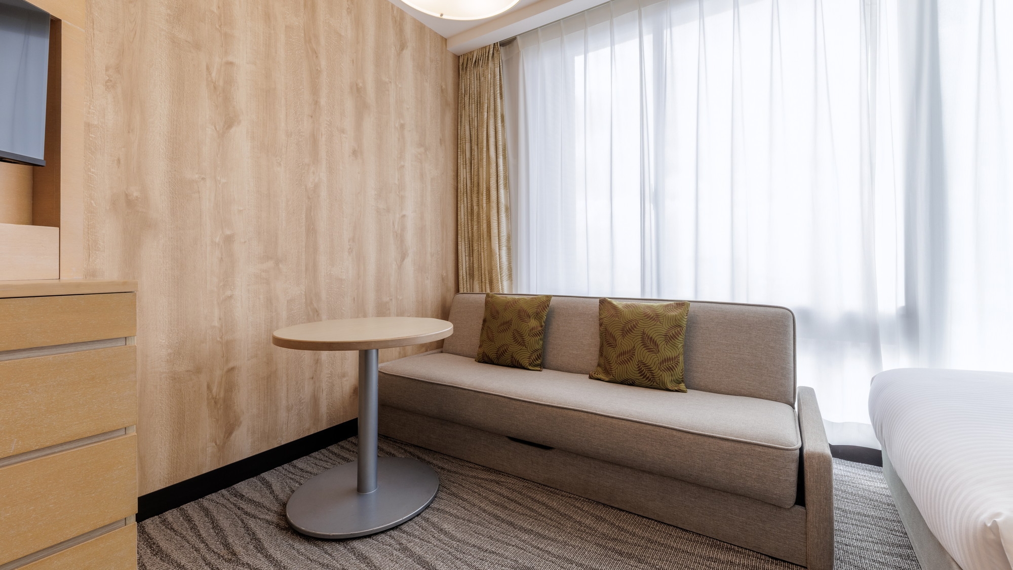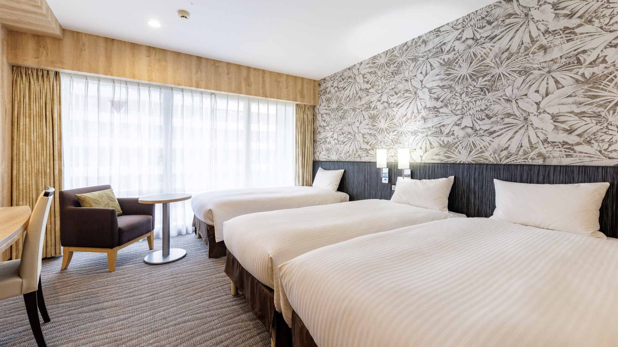 20.4平米のお部屋にシモンズ社製ベッド2台(幅:約110cm)+ソファベッド1台、室内バスルーム:ユニットバスタイプ