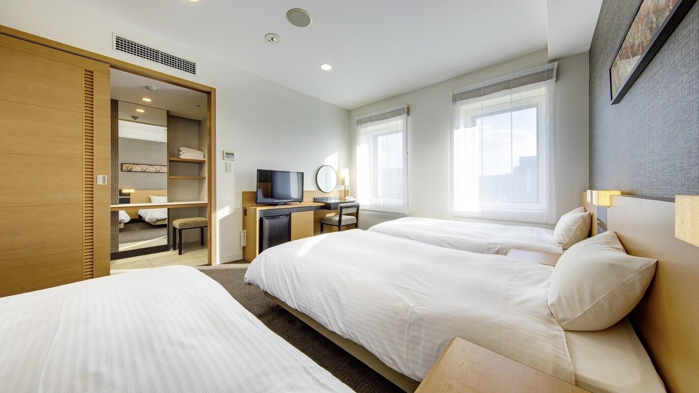 ユニットバスの入り口にクローゼット付パウダールームをご用意。ベッドサイズ:幅1030mm×長さ1950mm、エキストラベッド幅970mm×長さ1950mm
