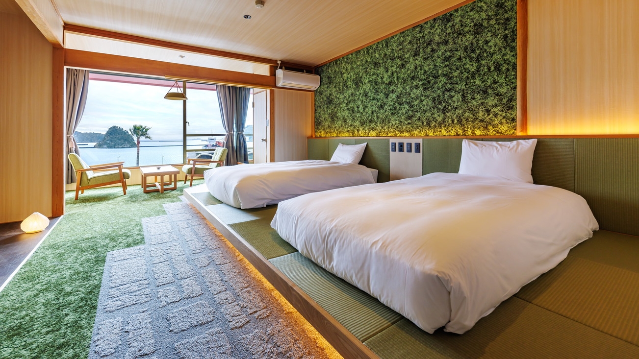【全室オーシャンビュー】6階:NEOジャパネスク、5階:Theリゾート、4階:黒船・和モダンの3タイプのコンセプトフロアの客室です。 ローベッド×2+エクストラ