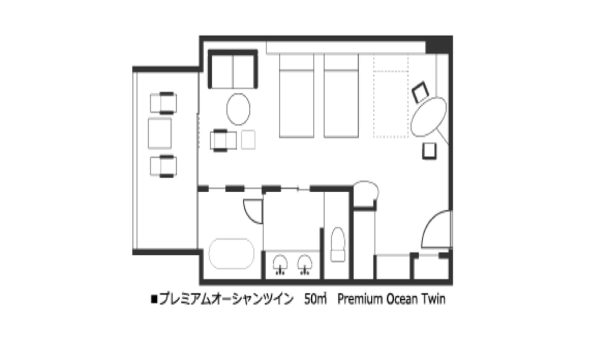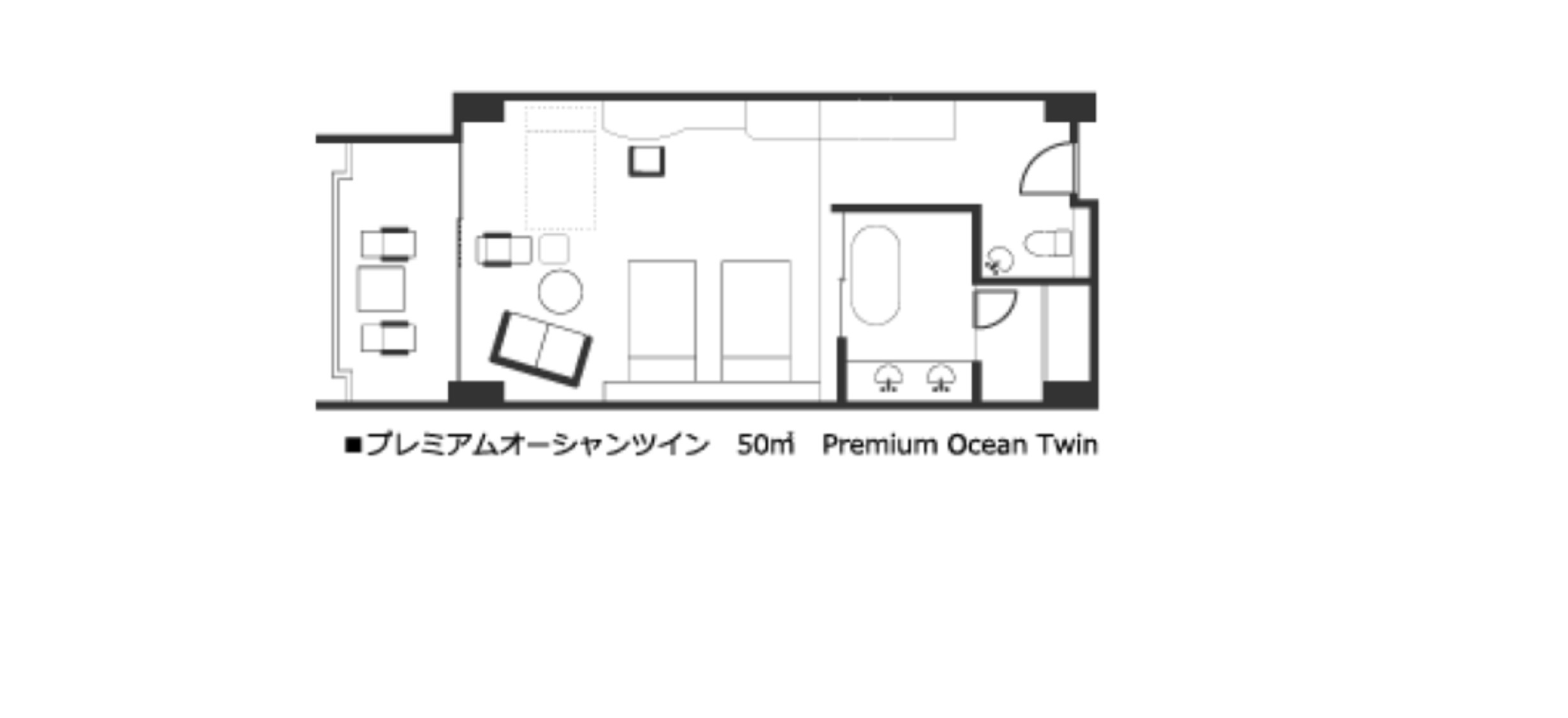 【メインタワー】バルコニー付オーシャンビュー、セミダブルベッドを2台配置したお部屋。洗い場付きバスルーム完備。1室3名様又は4名様の場合は追加でベッドをご用意