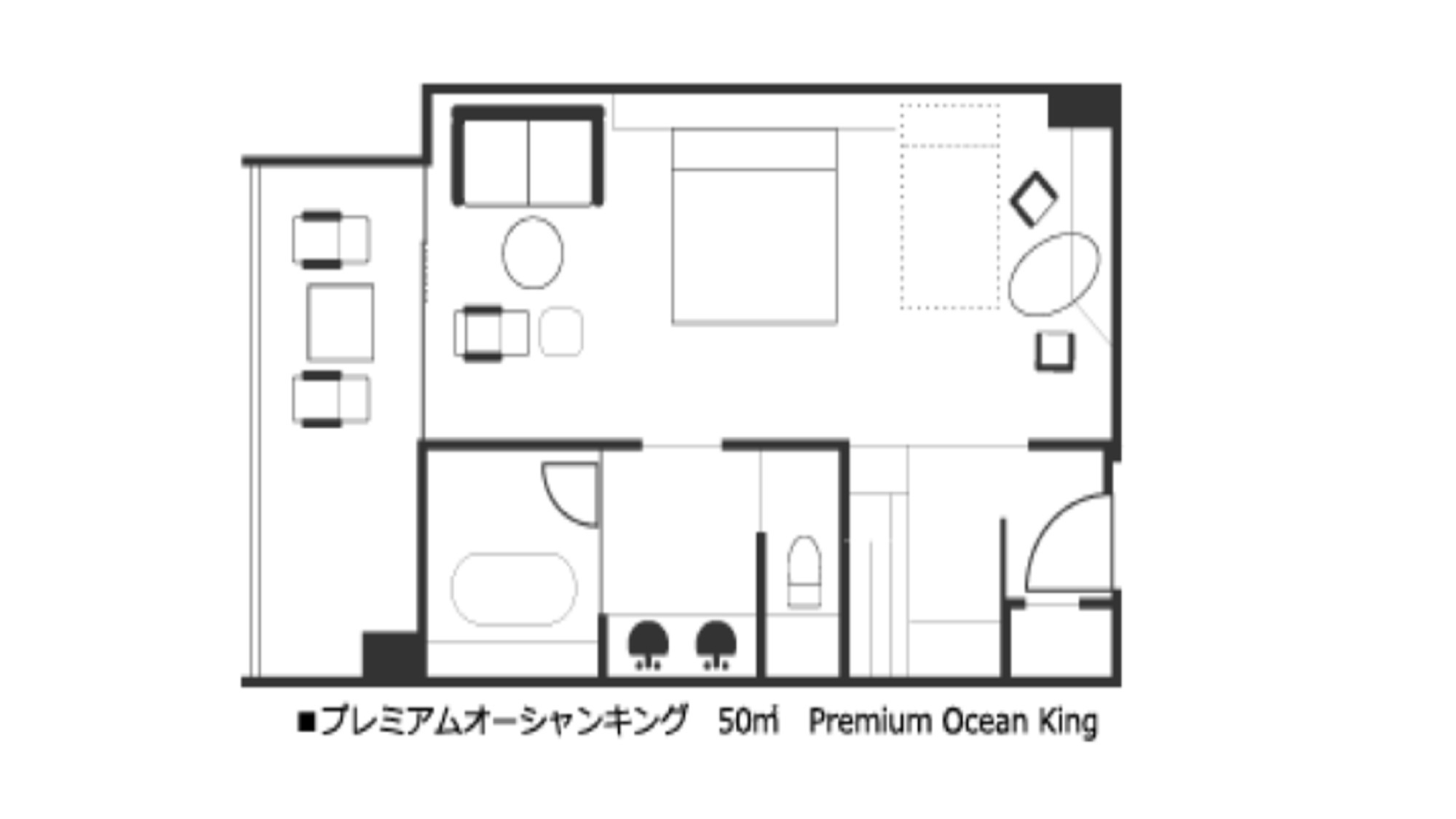 バルコニー付オーシャンビュー、ダブルベッドを設置したお部屋。洗い場付きバスルーム、レインフォレストシャワー全室完備。