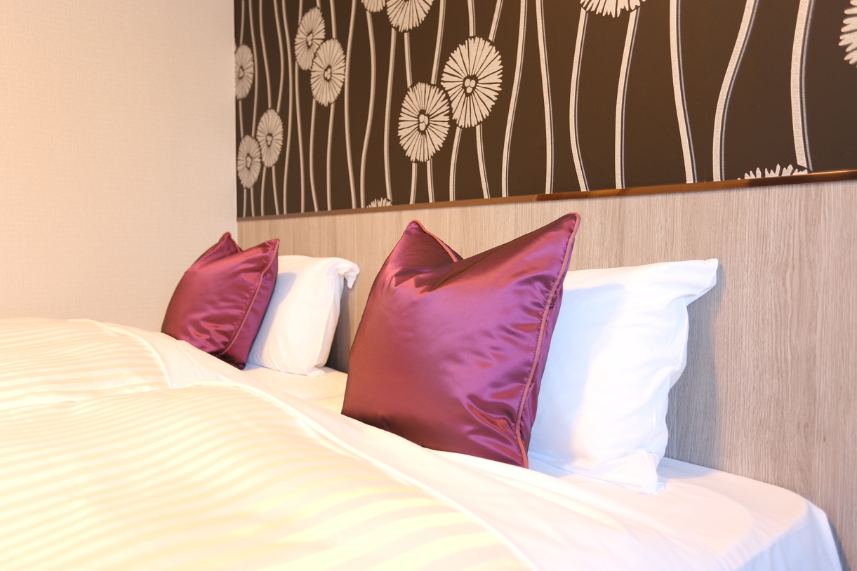 お部屋広さ14平米。ベッド幅は90cmのシングルベッド2台。 ※基本設定は2台のシングルベッドを隙間なく並べて配置しております。