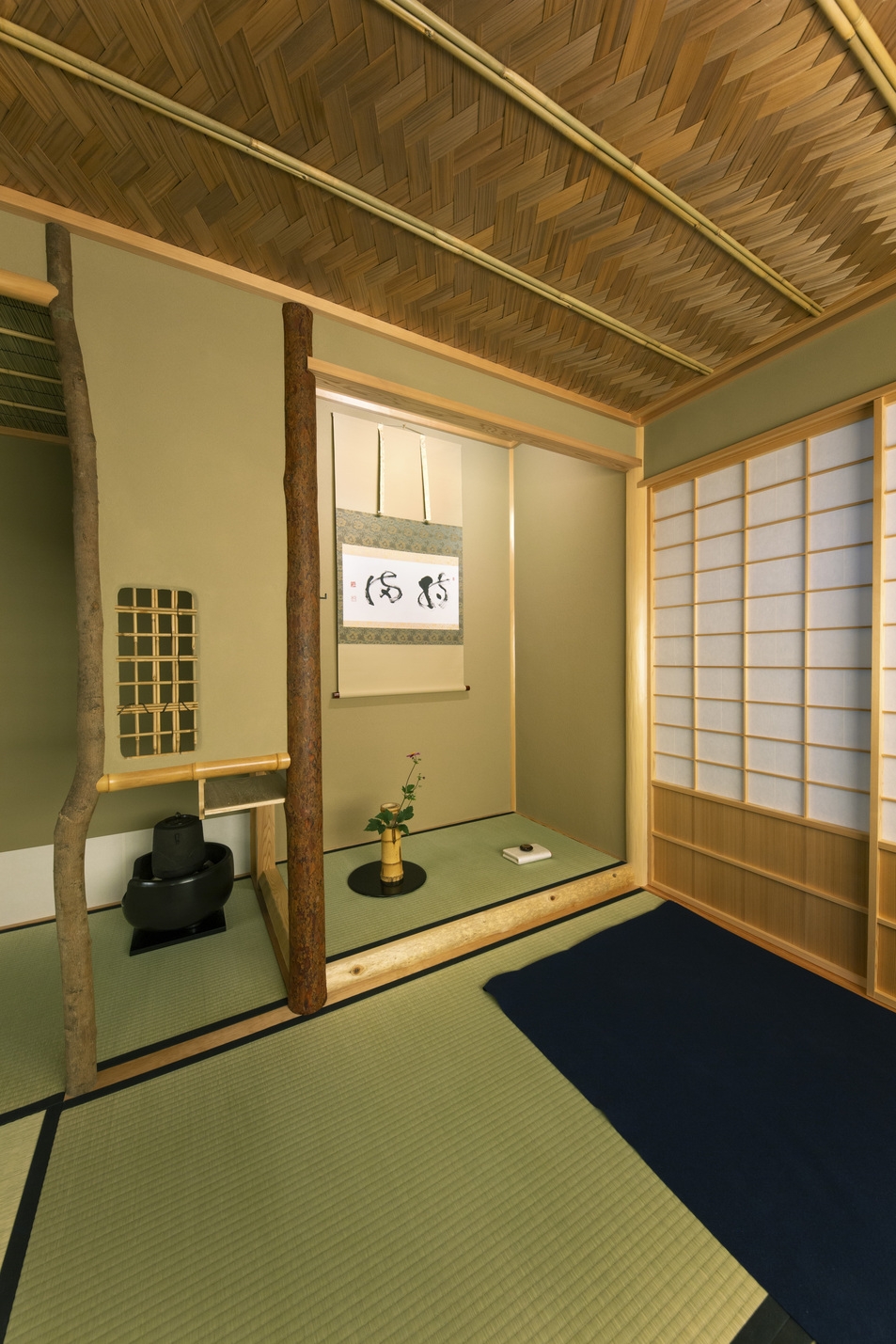 匠の京町家の一階に茶室を作りました。裏千家ミリエーム様による3畳台目と6畳和室。どちらにも炉はございます。静佳庵(せいかあん)とお名前を頂戴致しました。