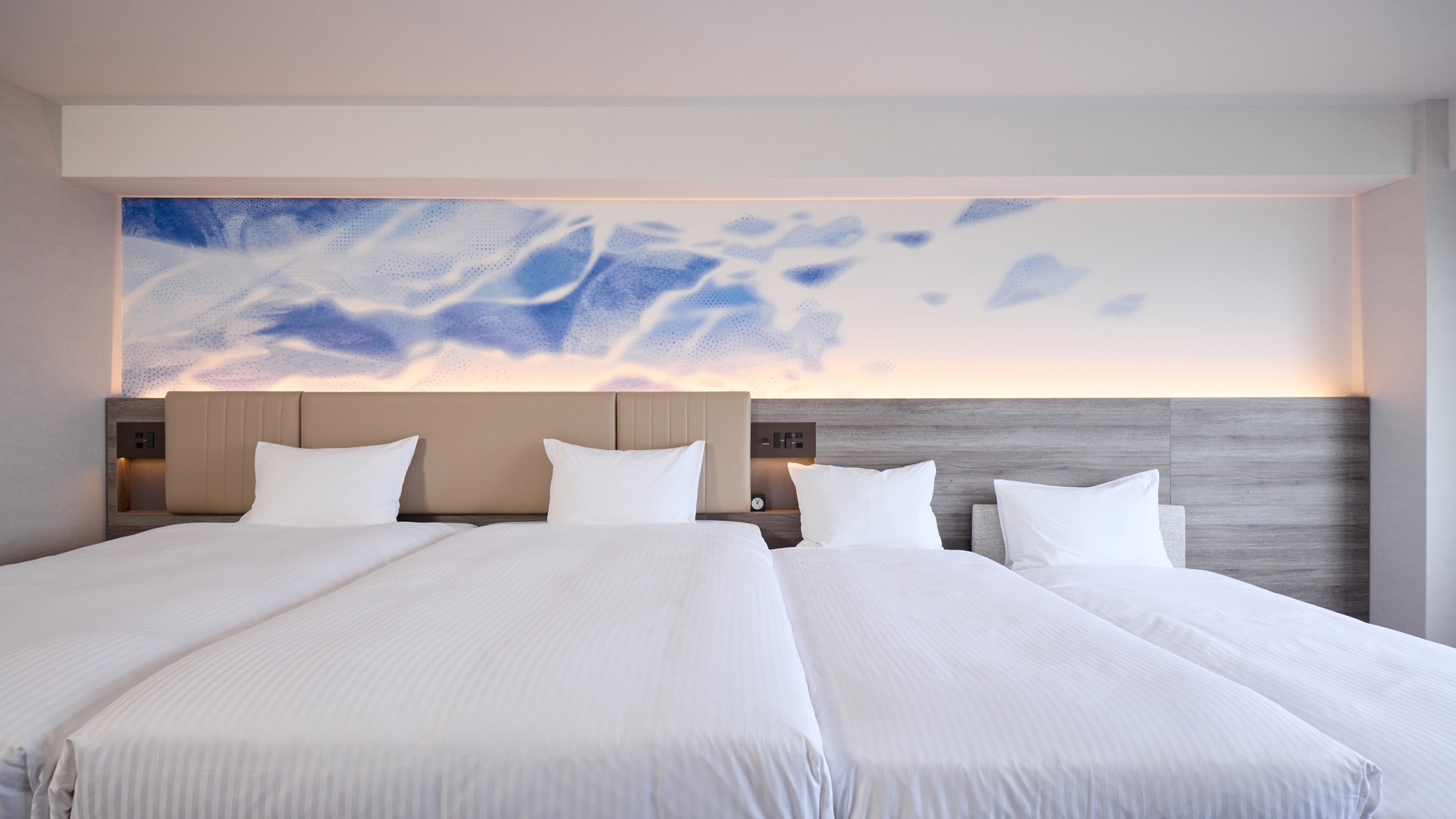 8階.9階に位置する33平の洋室。正ベッド2台(1200×2060)、3人目以降はエキストラ。バストイレ洗面所はユニットバス。全室禁煙、※2024年4月改装済み