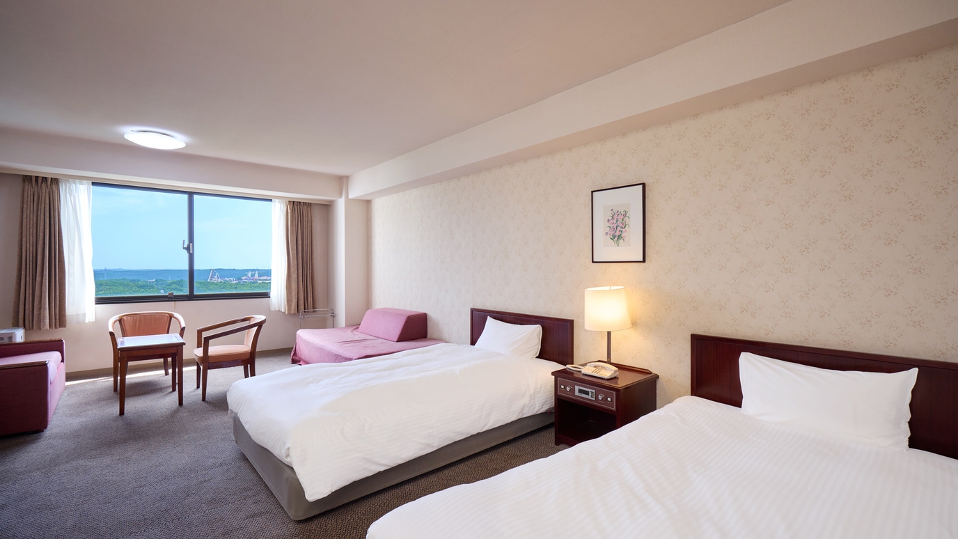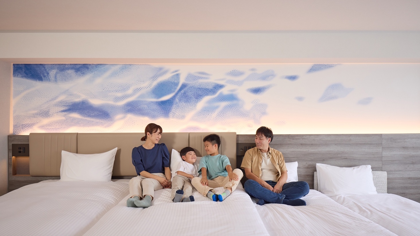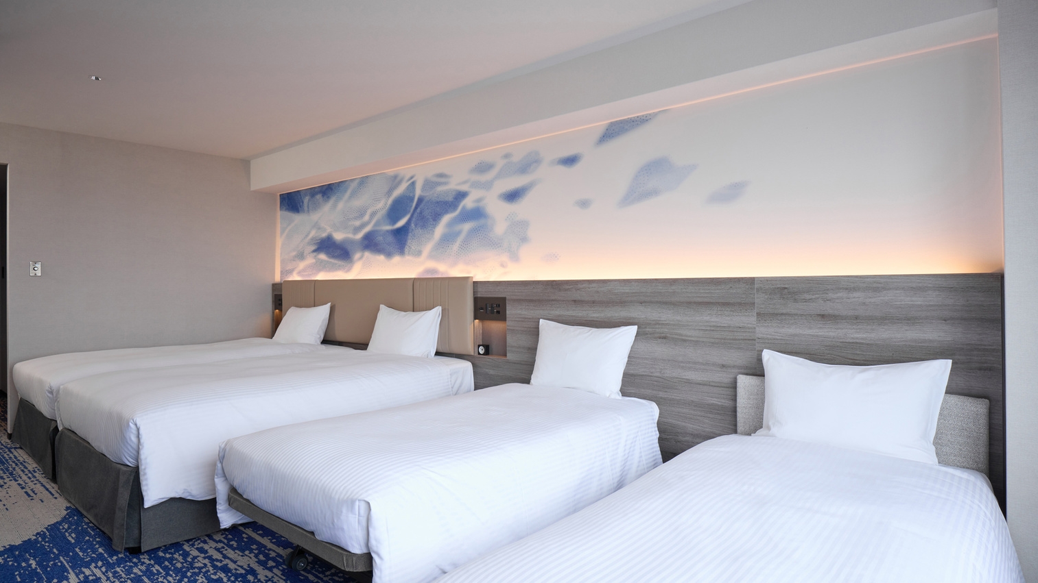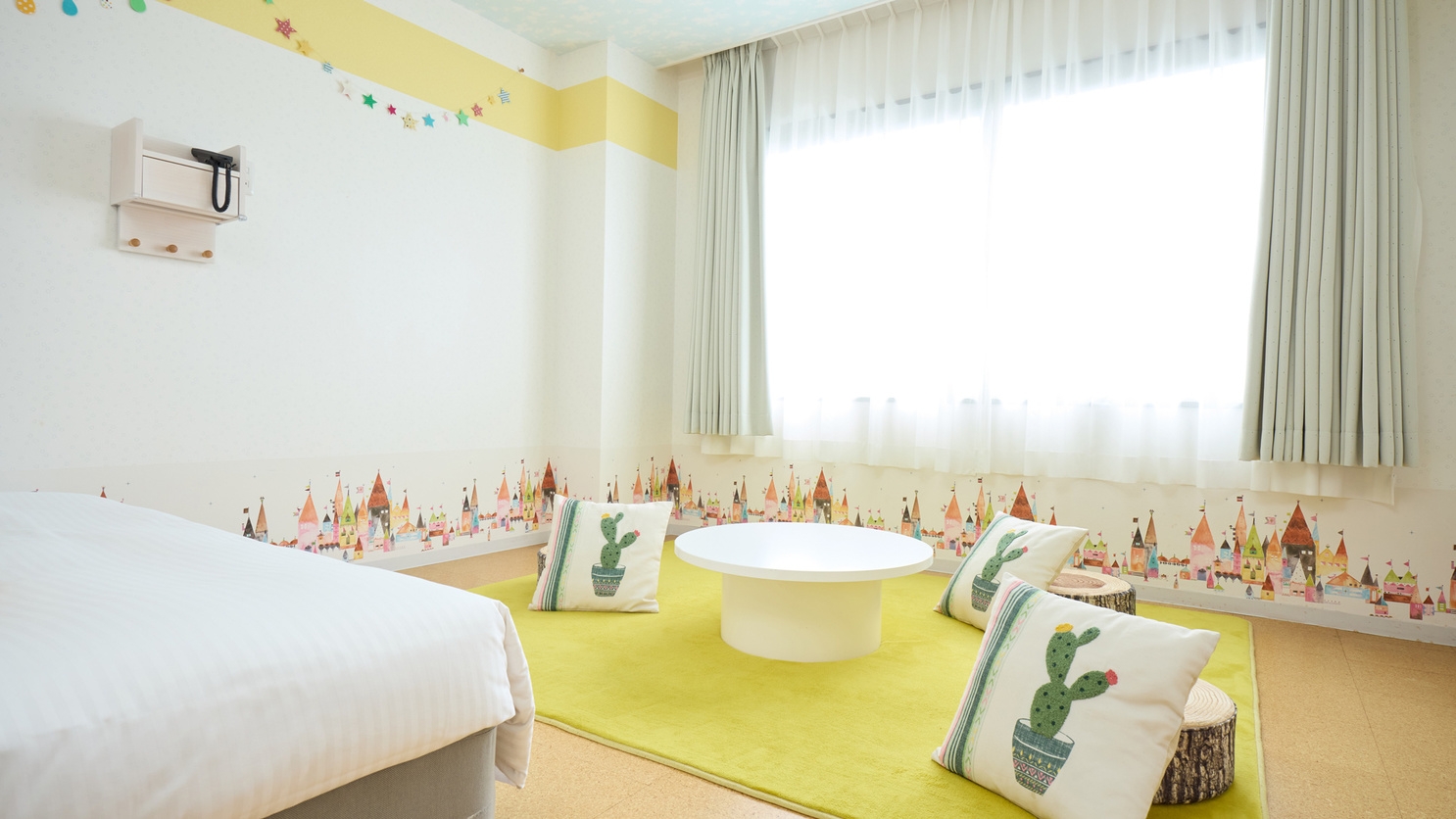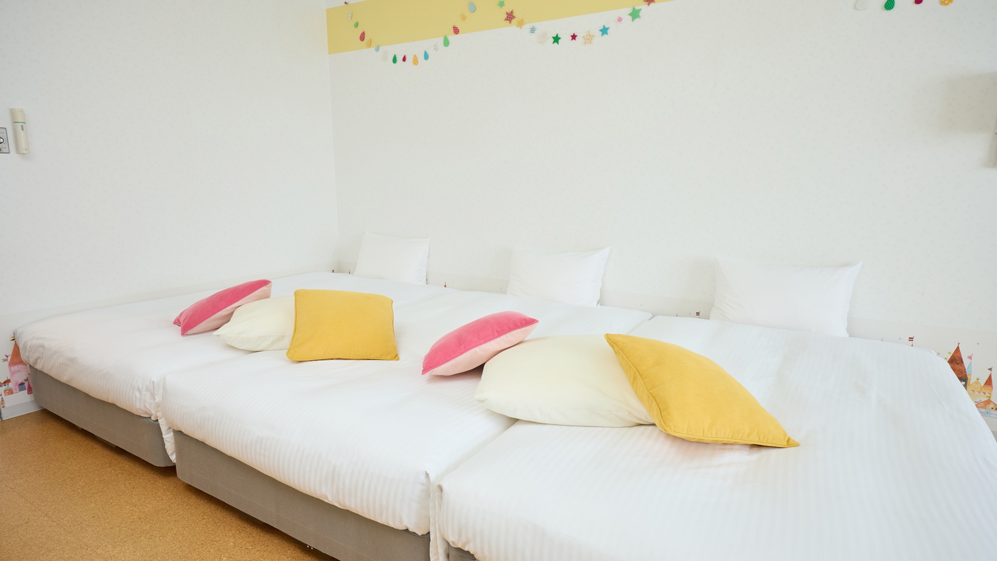 11階に位置する36平米の洋室、正ベッド3台(1200×2060)がくっついたお部屋です。ユニットバス。全室禁煙、電子レンジ有※床がコルク地で小さいお子様向け